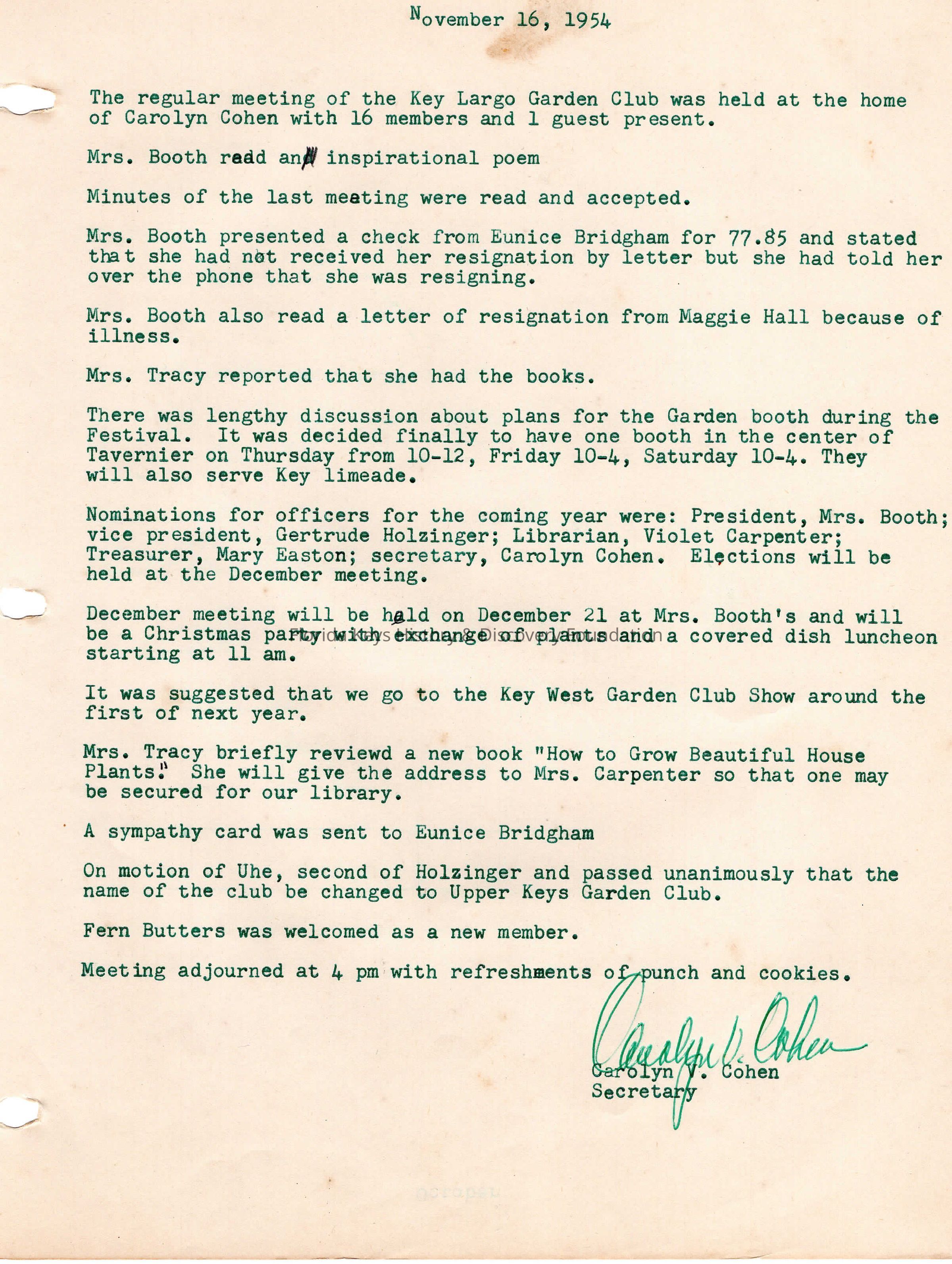 Members vote to change the name of the club to the Upper Keys Garden Club. Maggie Hall resigns from club due to illness.Collection