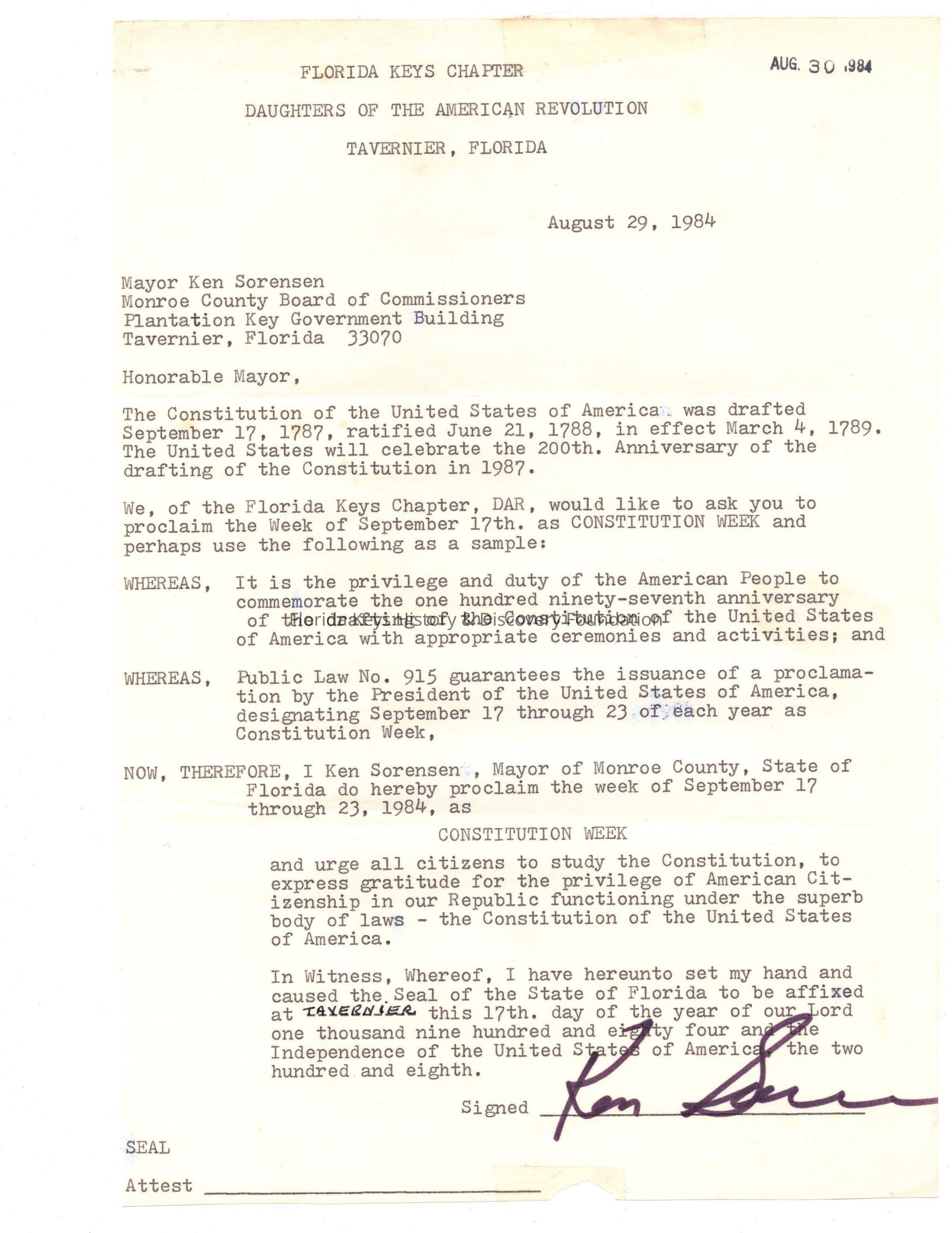 Florida Keys DAR ask for Mayor to consider the Week of September 17 Constitution WeekWho