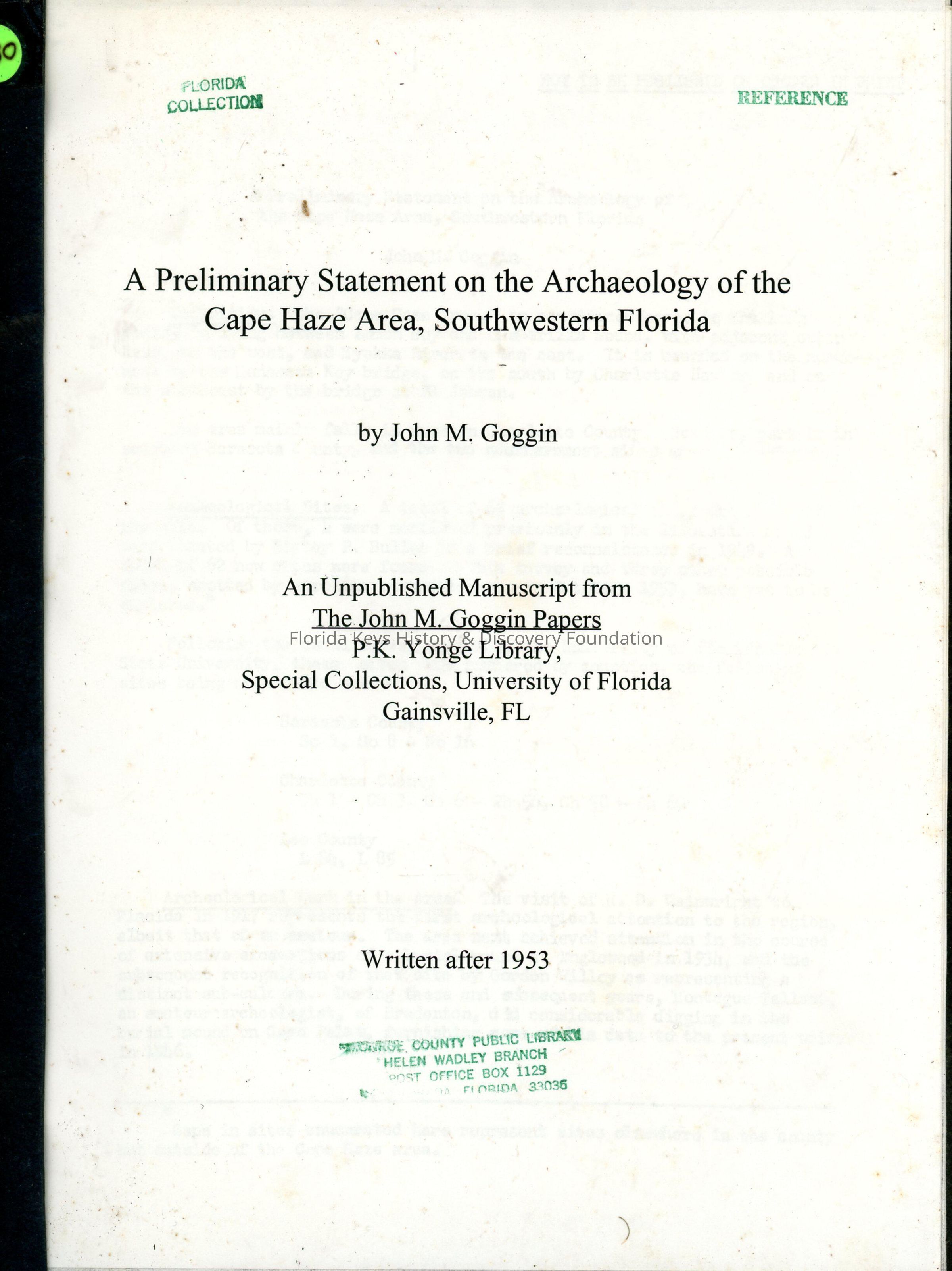 A Preliminary Statement on the Archaeology of the Cape Haze Area, Southwestern FloridaEntry/Object ID