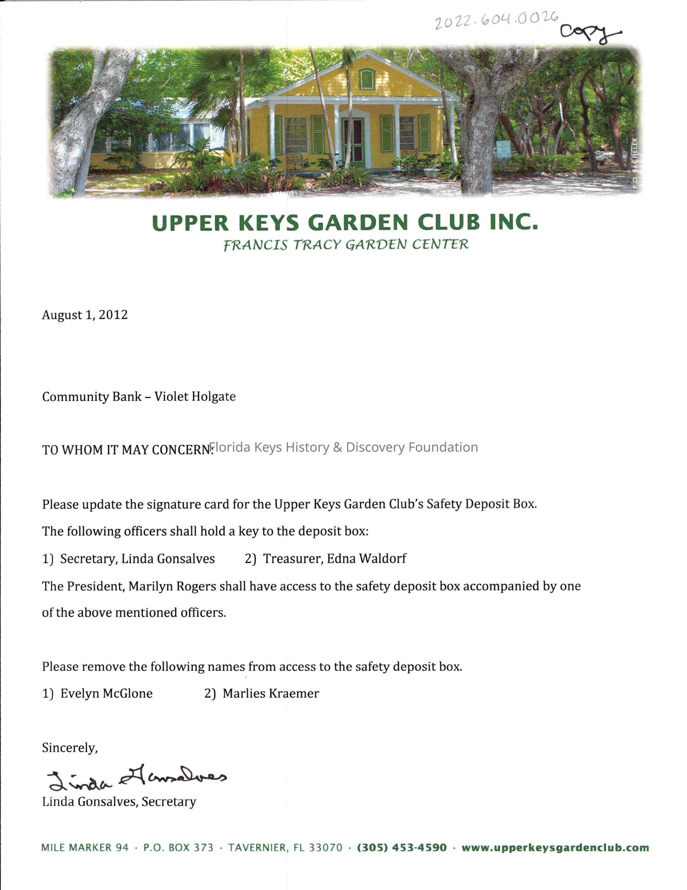 Upper Keys Garden Club Safety Deposit Box UpdatesEntry/Object ID