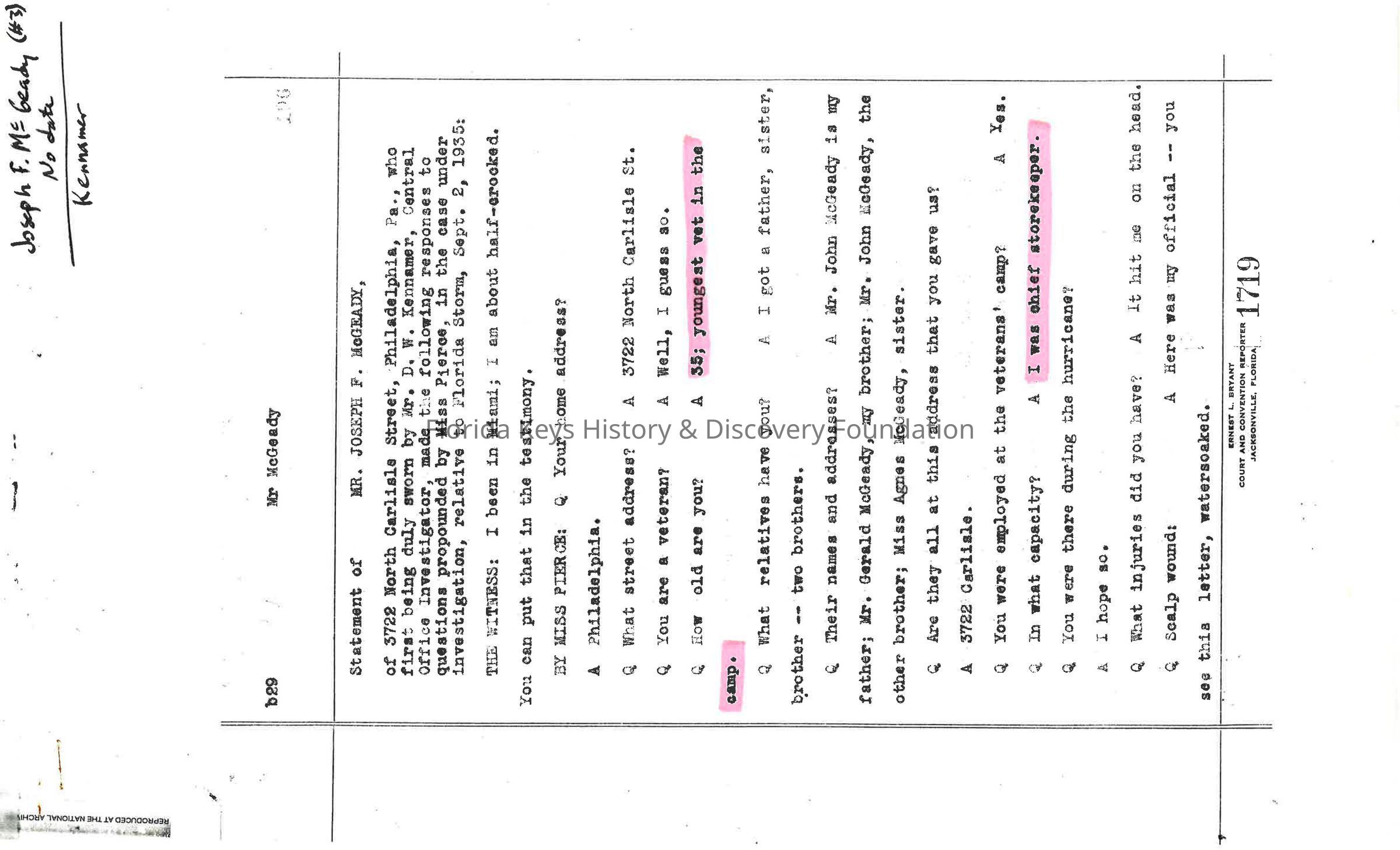 "Statement of Mr. Joseph F. McGeady, of 3722 North Carlisle Street, Philadelphia, Pa., who first being duly sworn by Mr. D. W. Kennamer, Central Office Investigator, made the following responses to questions propounded by Miss Pierce, in the case under investigation, relative to Florida Storm, Sept. 2, 1935..."Creator