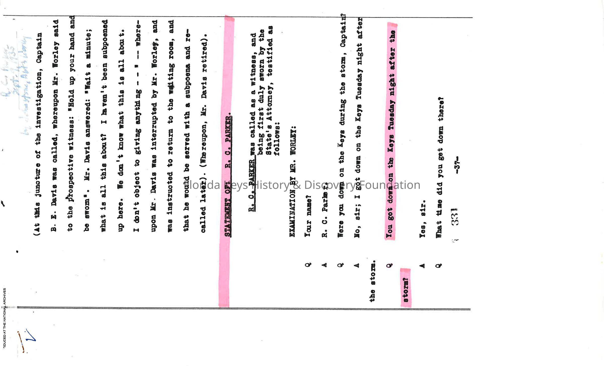 Sept. 9, 1935, Statement of R. C. Parker, examination by Mr. Worley. "R. C. Parker was called as a witness, and being first duly sworn by the State's Attorney, testified as follows..."Creator