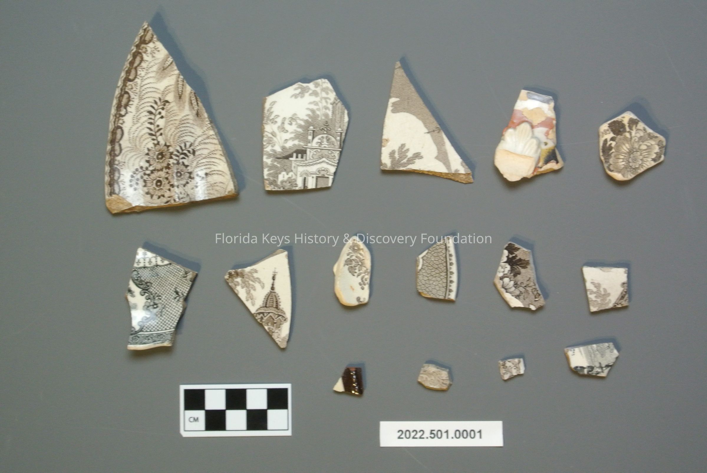 Group of ceramic sherds with sepia and brown printed designs.Collection