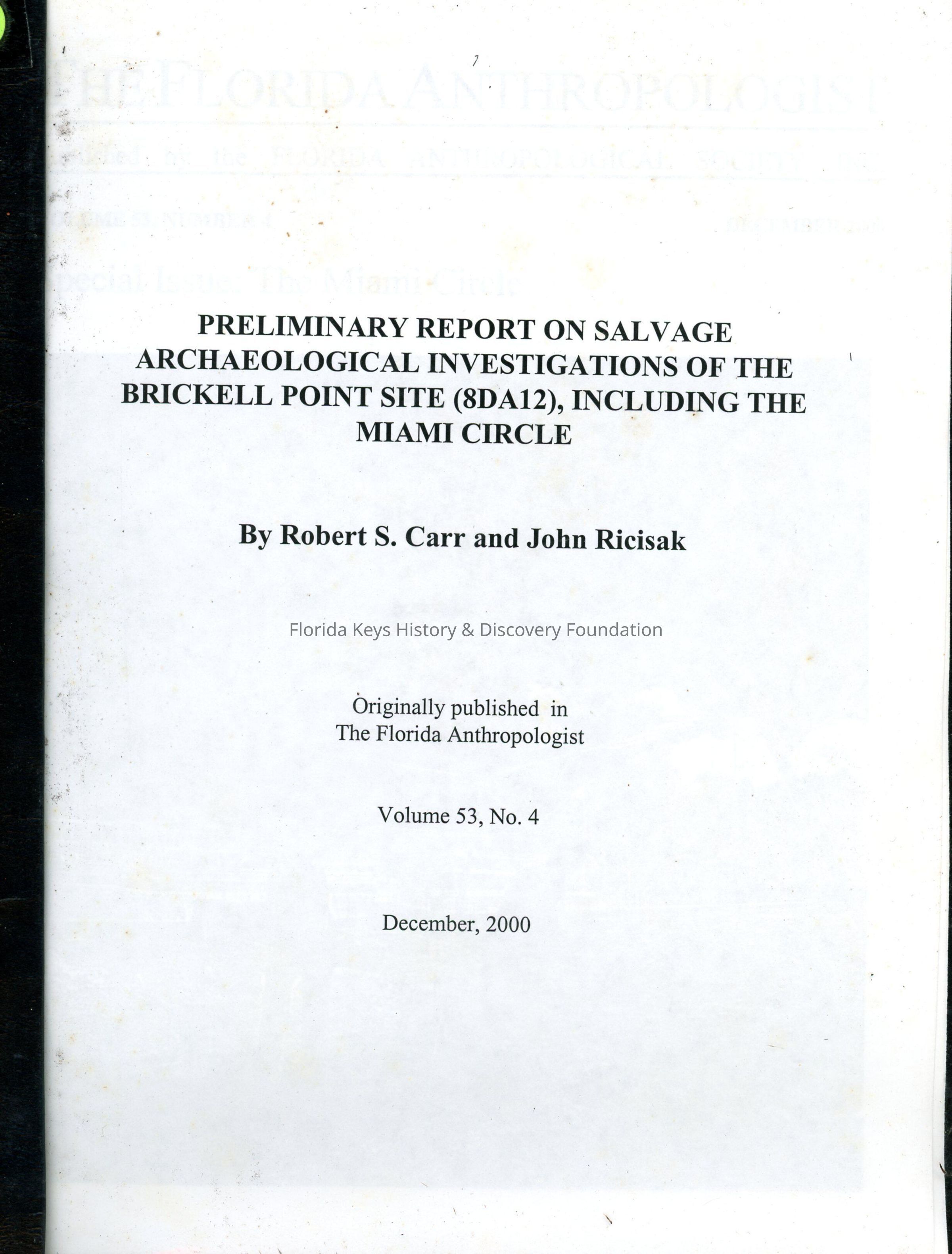 Preliminary Report on Salvage Archaeological Investigations of the Brickell Point Site (8DA12), Including the Miami CircleEntry/Object ID
