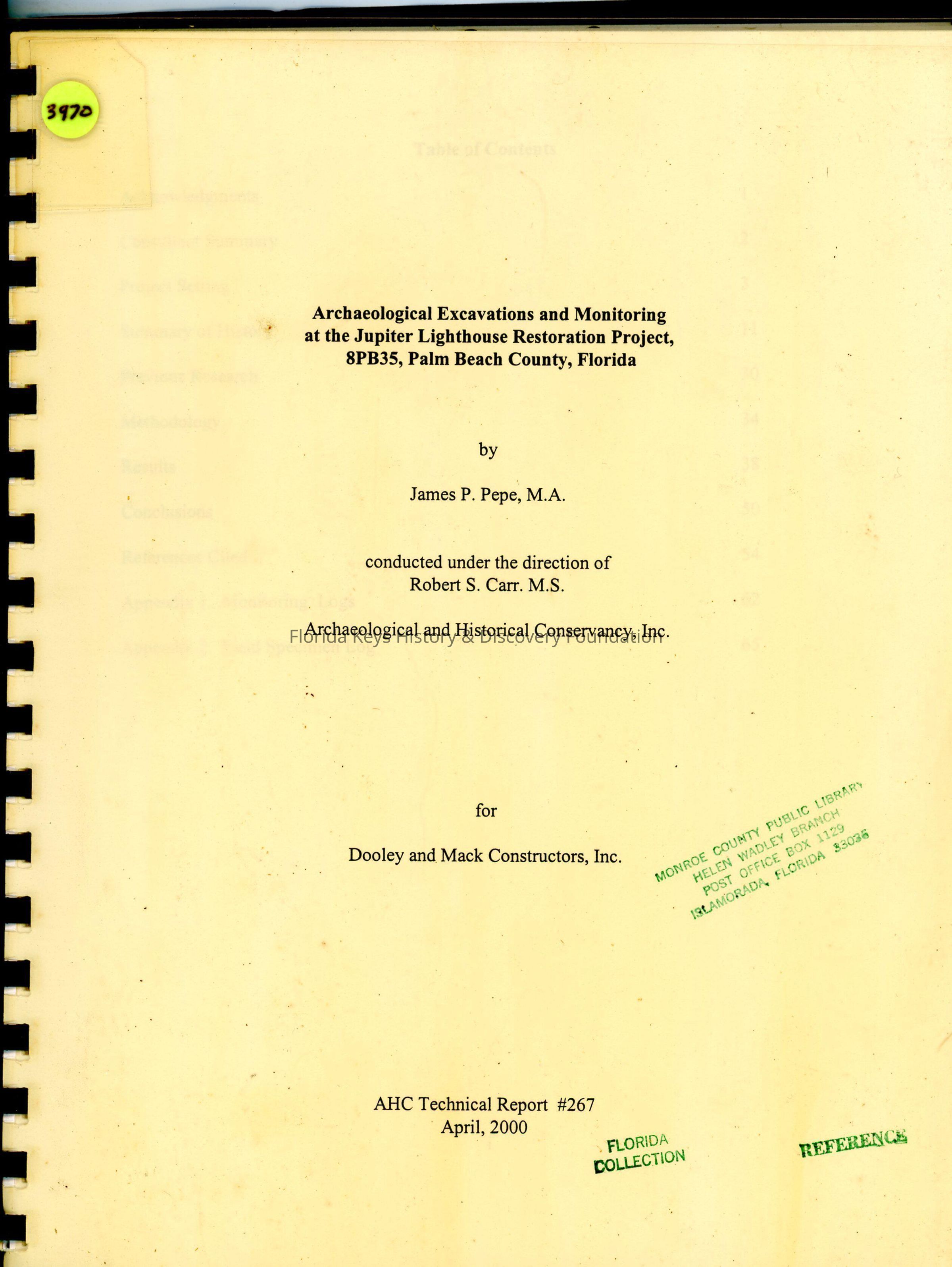 Archaeological Excavations and Monitoring at the Jupiter Lighthouse Restoration Project, 8PB35, Palm Beach County, FloridaEntry/Object ID