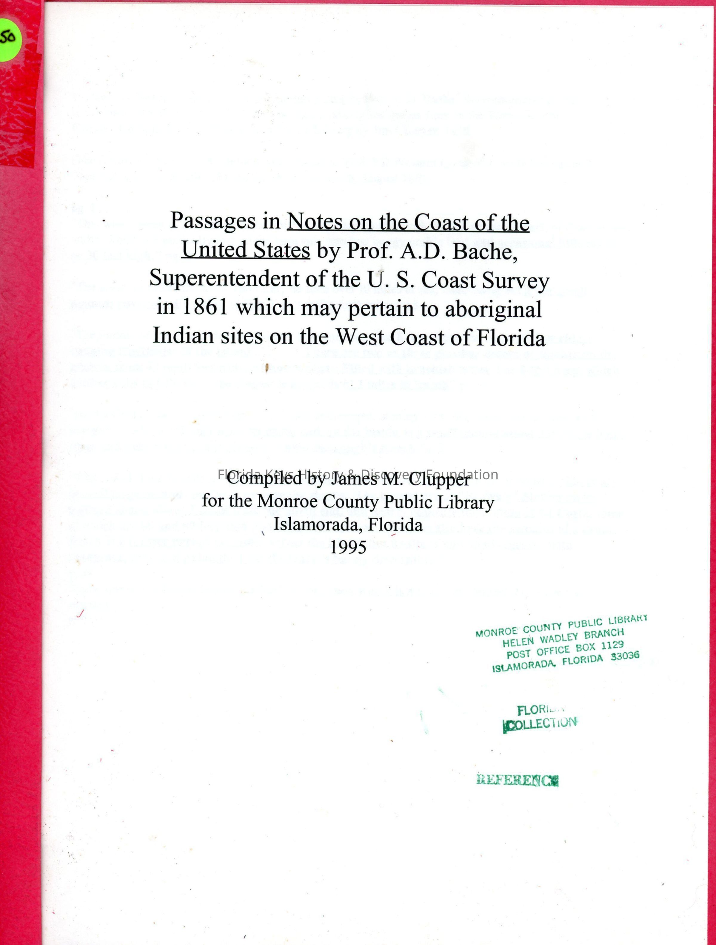 Passages in Notes on the Coast of the United States by Prof. A.D. Bache, Superentendent of the U.S. Coat Survey in 1861 which may pertain to aboriginal Indian sites on the West Coast of FloridaEntry/Object ID
