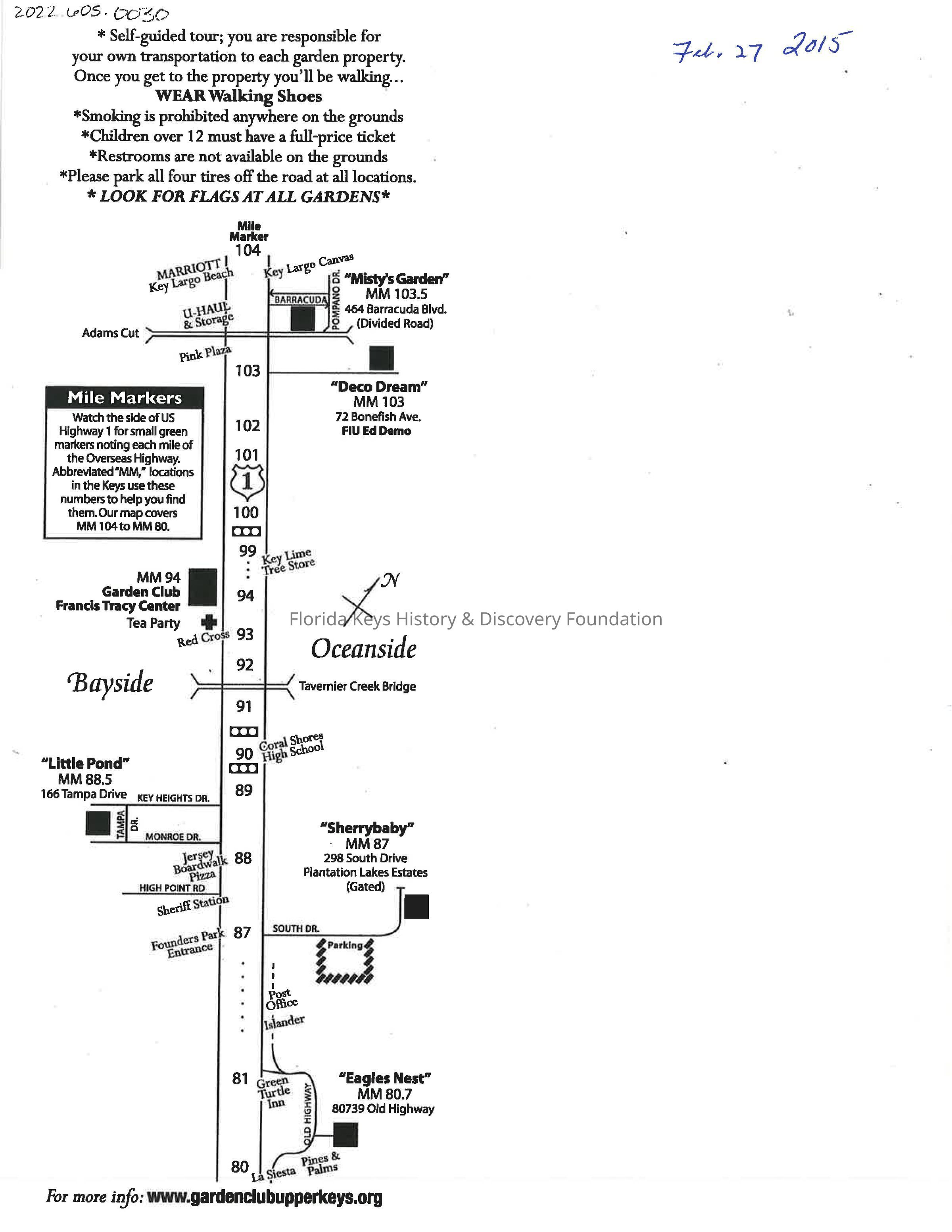 Copies of the 2015 Garden Walk Map for the event with helpful tips for visitors. 6 copies range from mile markers 80-103. The final copy has handwriting and ranges from mile markers 75-95.