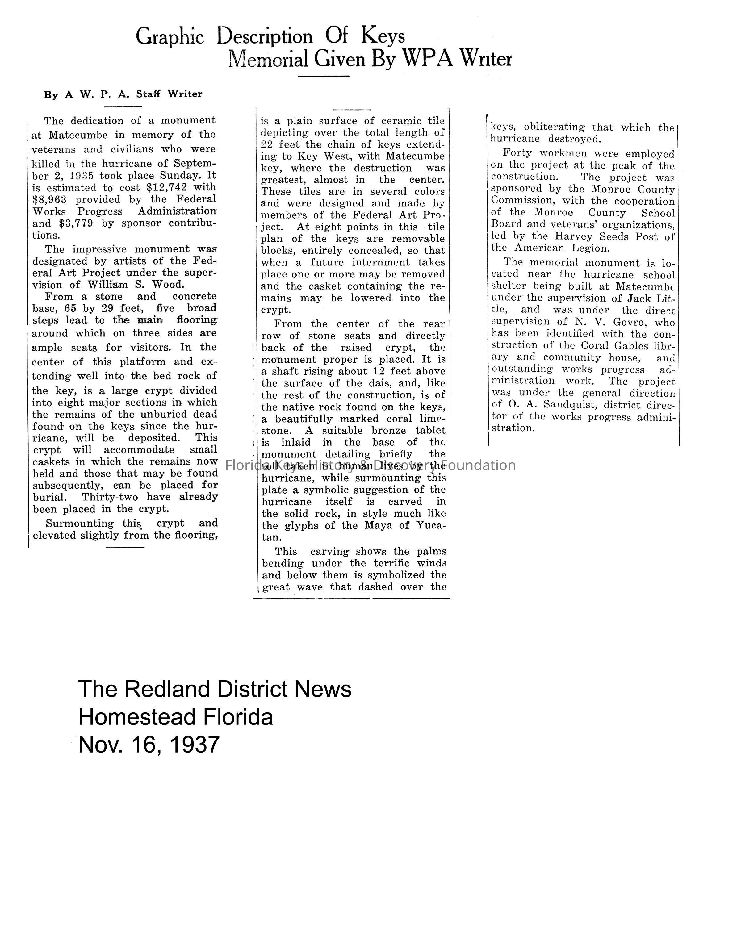 Graphic Description of Keys Memorial Given by WPA WriterCollection