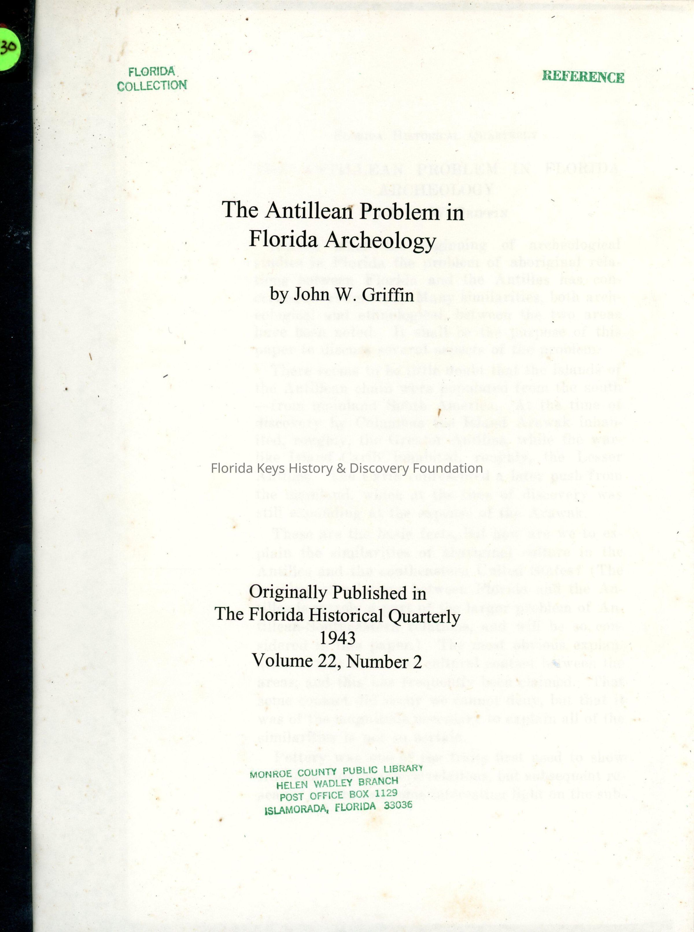 The Antillean Problem in Florida ArcheologyEntry/Object ID