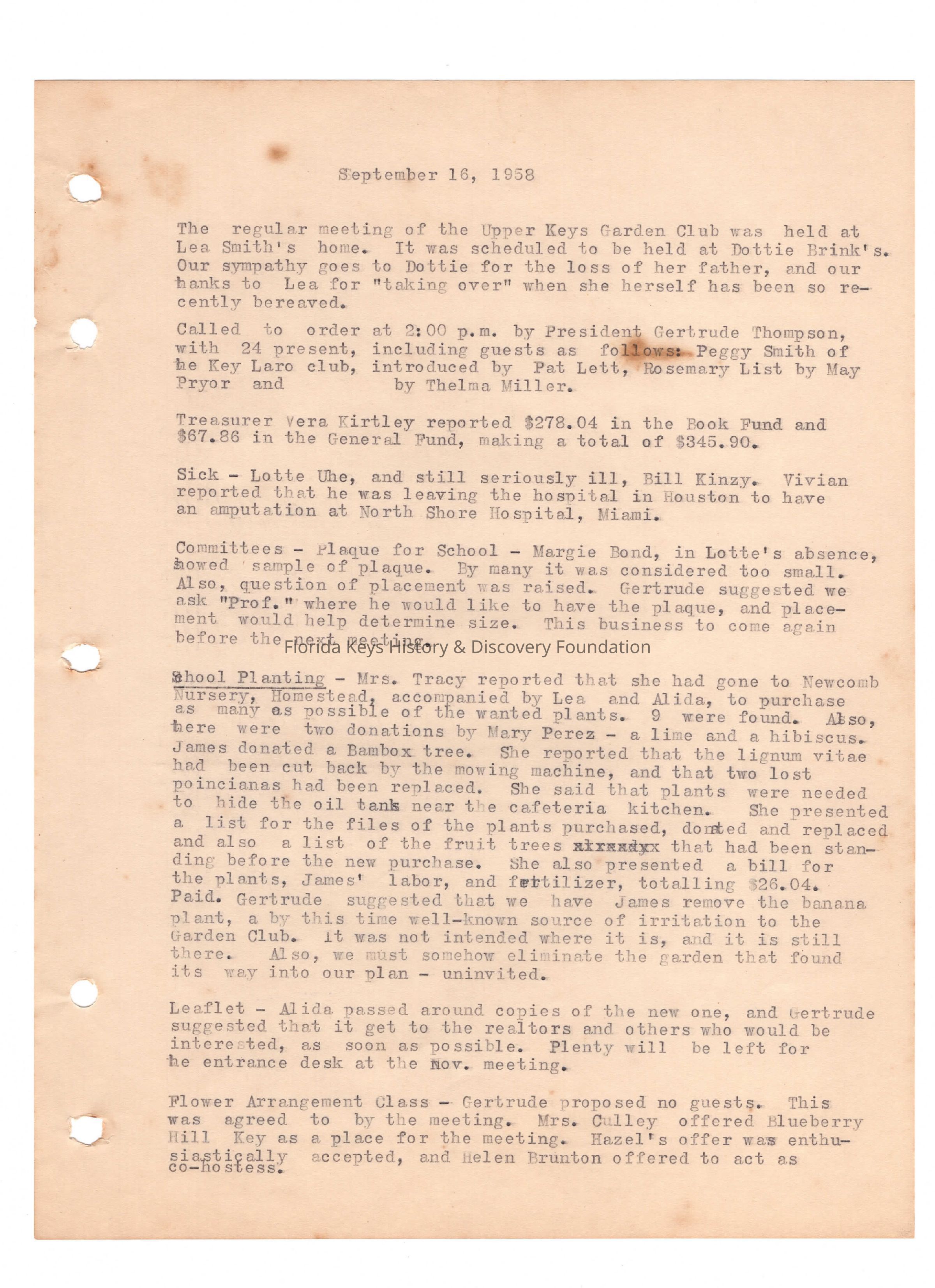 Minutes from club meeting held on Sept. 16th, 1958 at the home of Lea Smith.Collection
