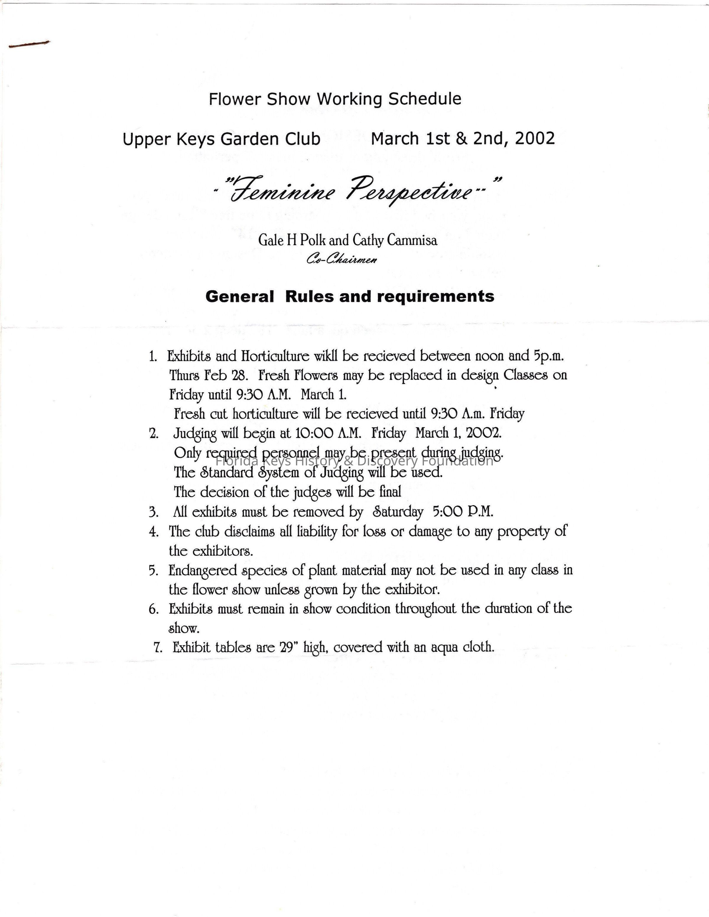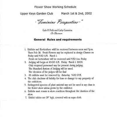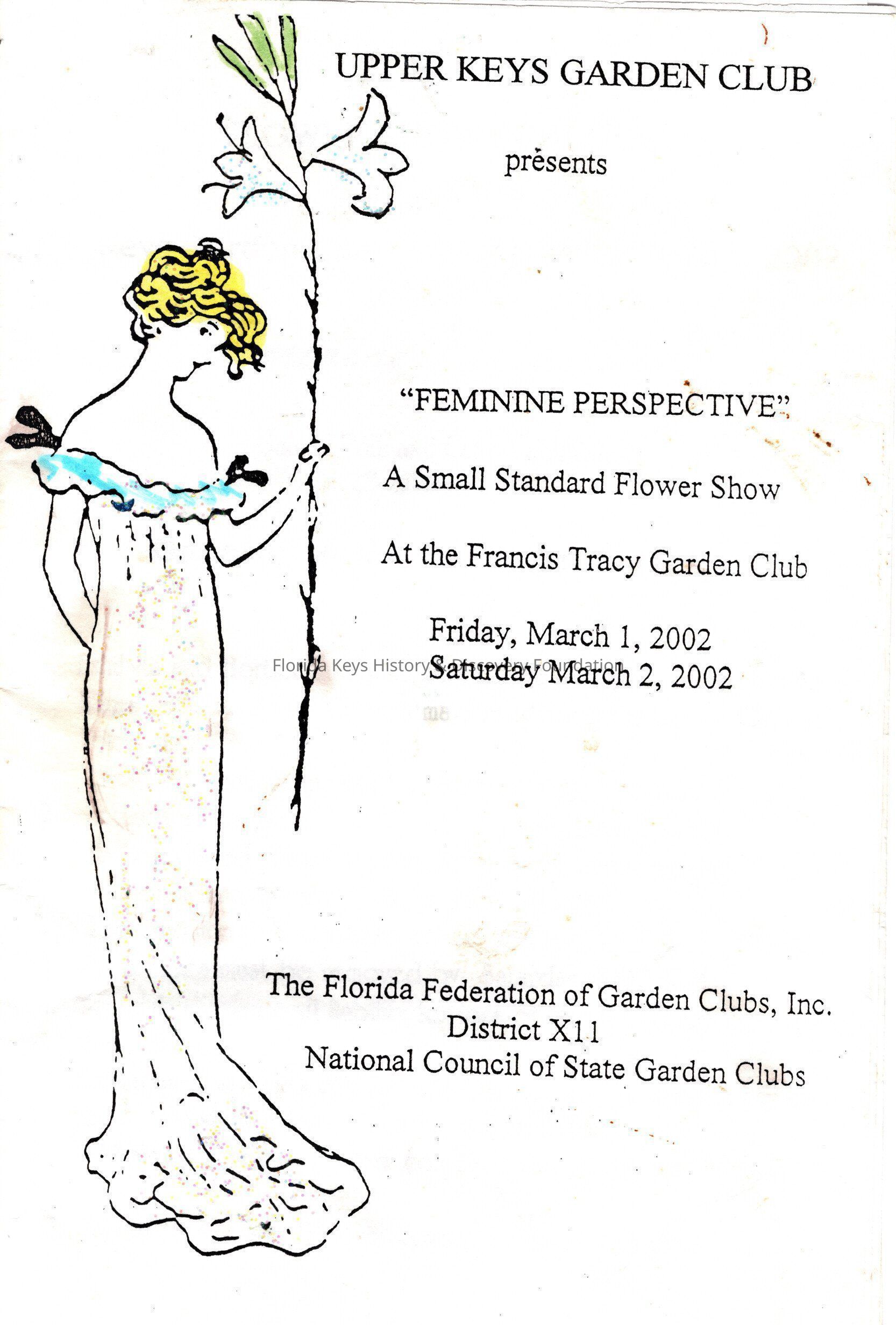 A pamphlet, working schedule, and photos from the Upper Keys Garden Club "Feminine Perspective" small standard flower show held at the Francis Tracy Garden Center on Friday, March 1st and Saturday, March 2nd 2002.