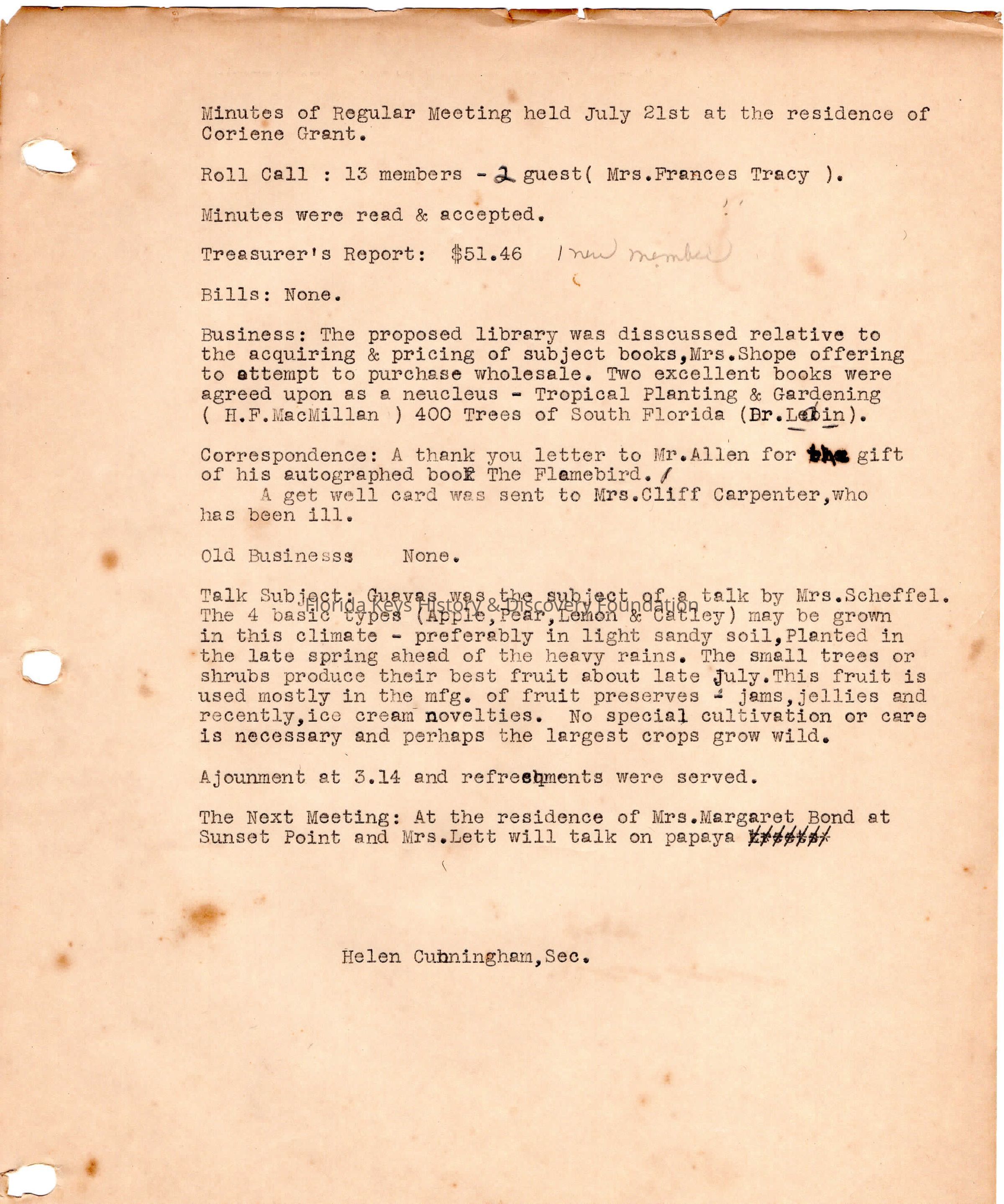 Minutes from meeting held on July 21st, 1953 at the home of Coriene Grant.Collection