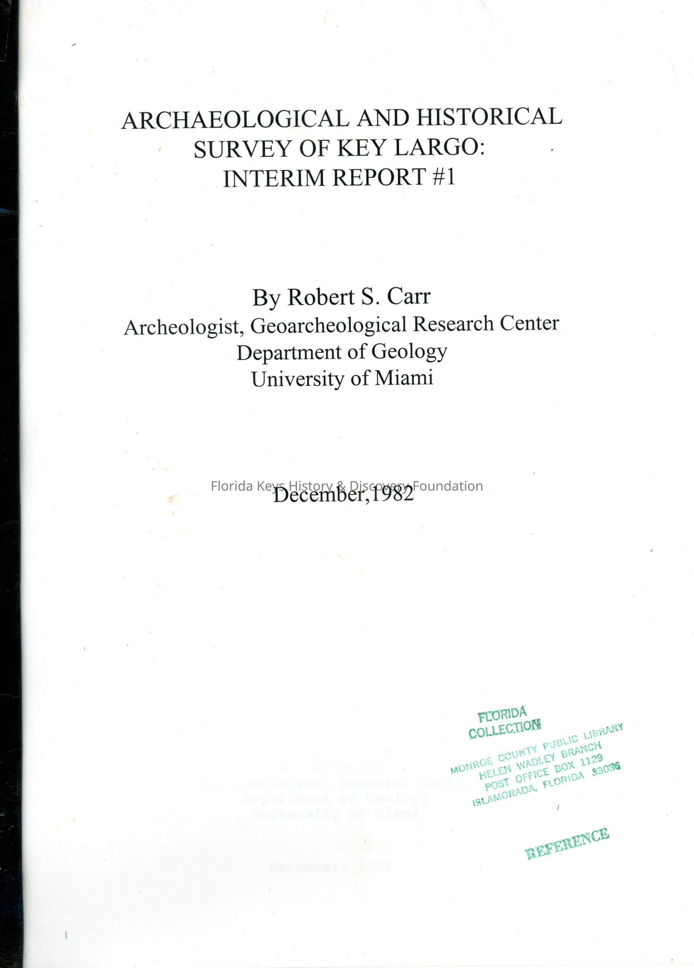 Archaeological and Historical Survey of Key Largo: Interim Report #1Entry/Object ID