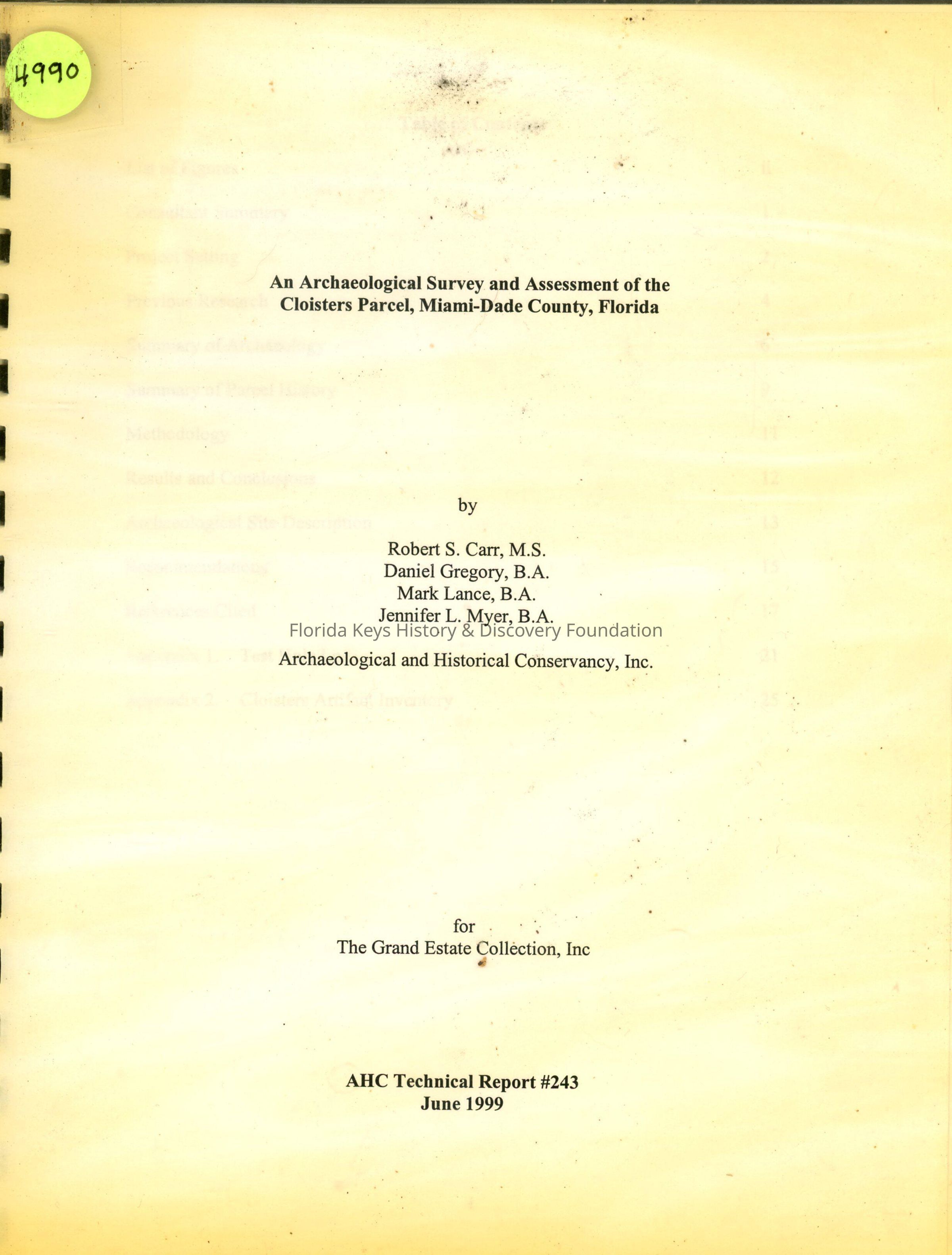 Archaeological Sites, Archaeological and Historical Conservancy, AHC Technical Report, Robert S. Carr, Daniel Gregory, Mark Lance, Jennifer L. Myer, Miami, Miami-Dade County, Cloisters, Cloisters ParcelSecondary Title