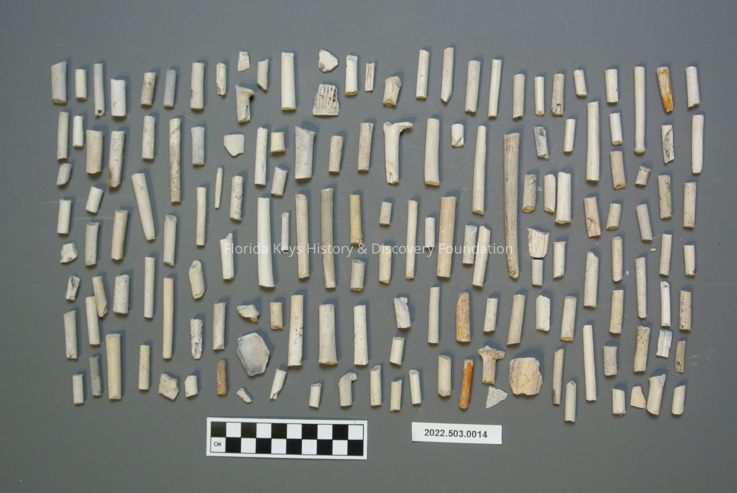 Collection of various clay pipe stems of different sizes, with some bowl fragmentsCollection