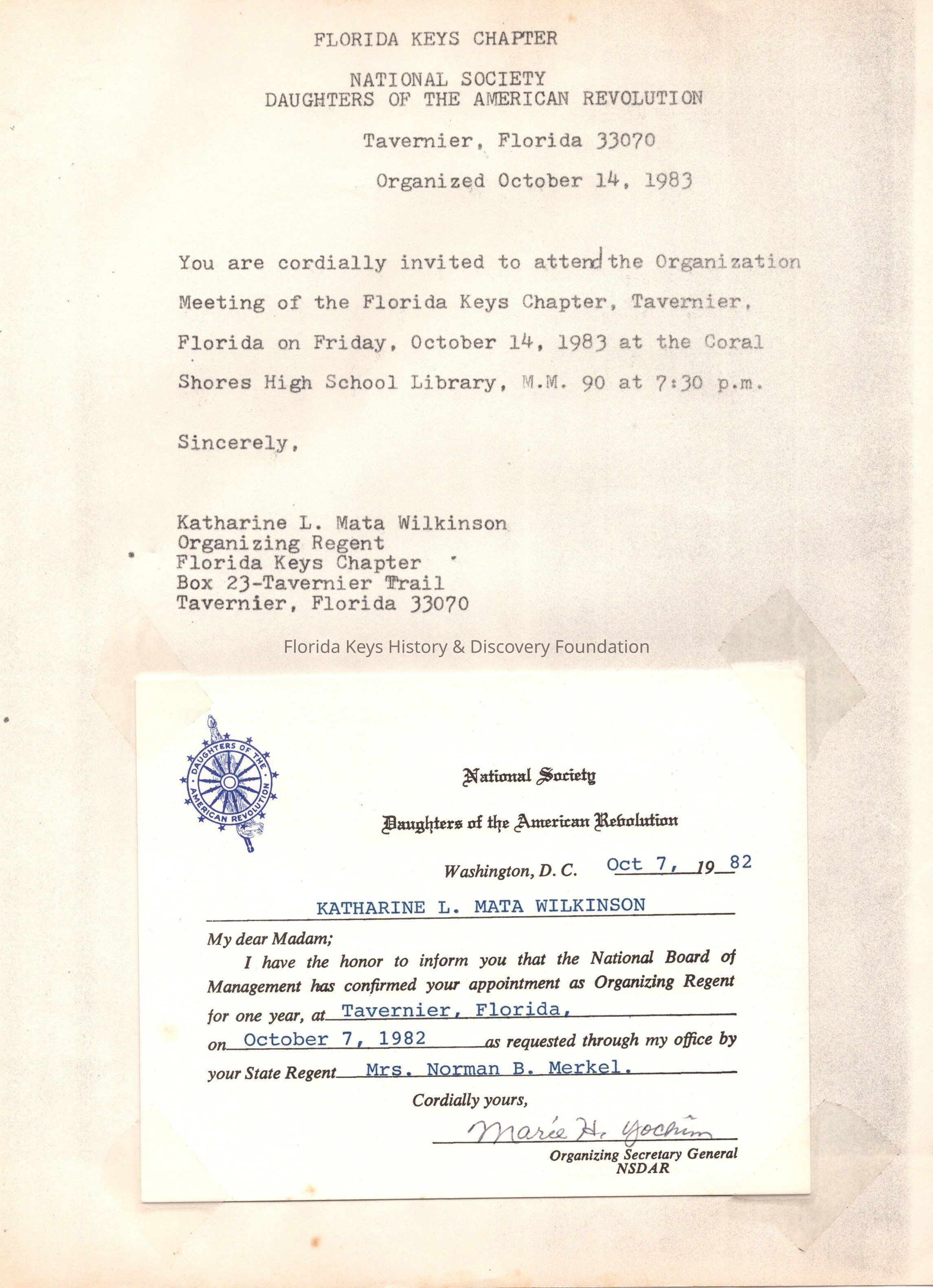 1980s, DAR, Daughters of the American Revolution, Katherine Wilkinson, Organizing Regent, Tavernier, NSDARDescription