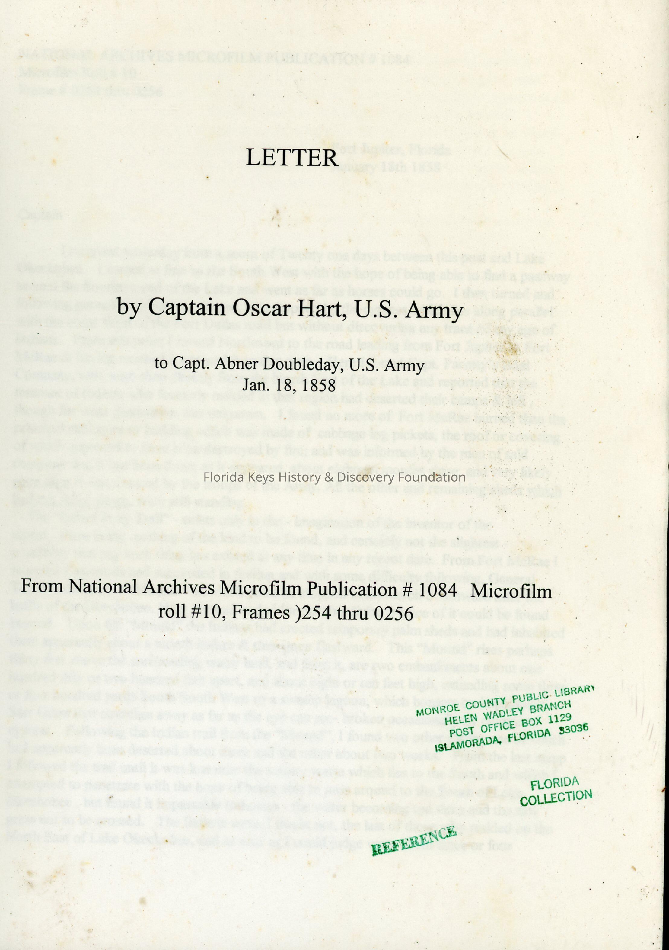 Letter by Captain Oscar Hart, U.S. Army to Capt. Abner Doubleday, U.S. Army (Jan. 18, 1858)Entry/Object ID