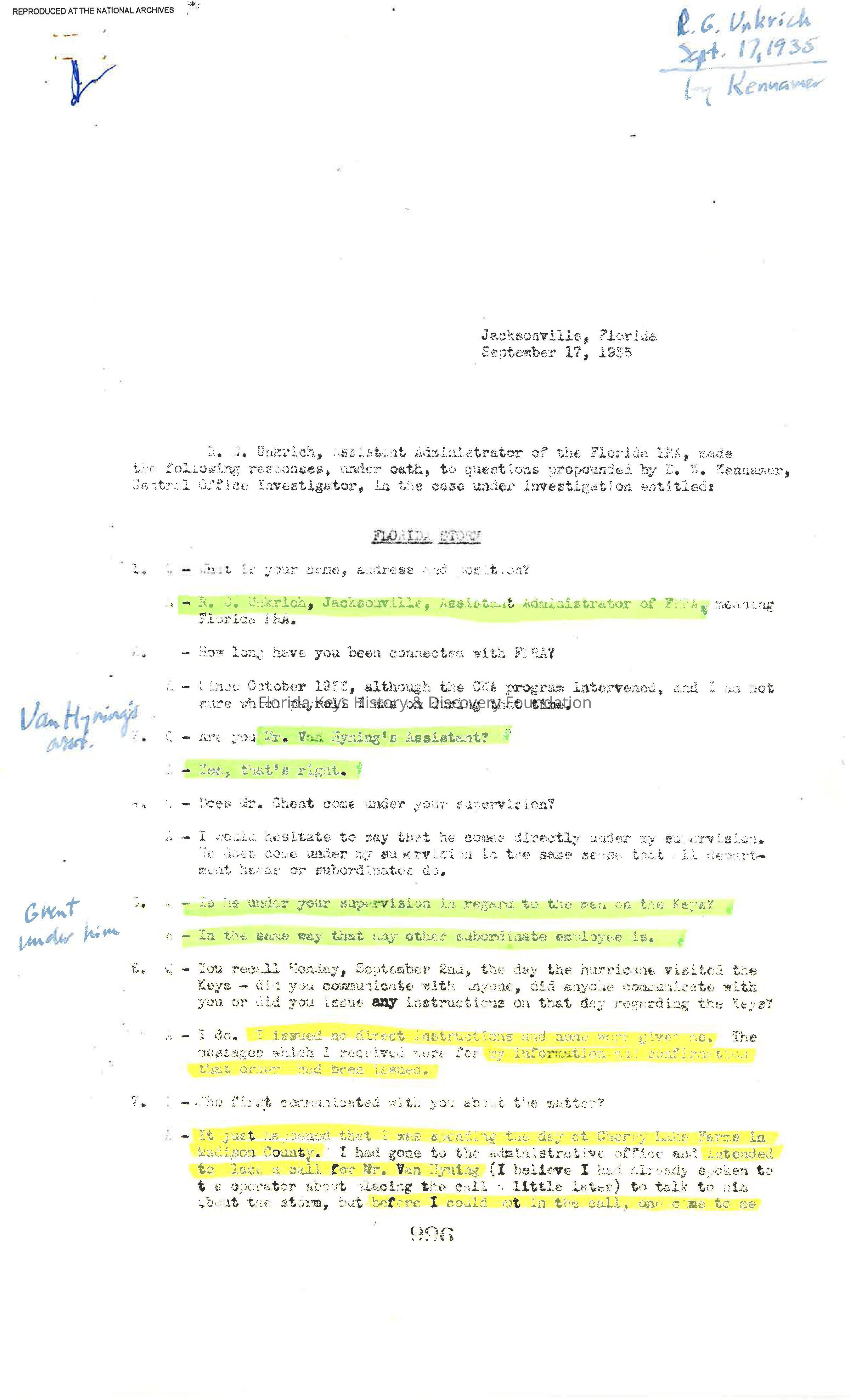 Sept. 17, 1935, "R. G. Unkrich, Assistant Administrator of the Florida ERA, made the following responses, under oath, to questions propounded by D. W. Kennamer, Central Office investigator, in the case under investigation entitled: Florida Storm"Creator