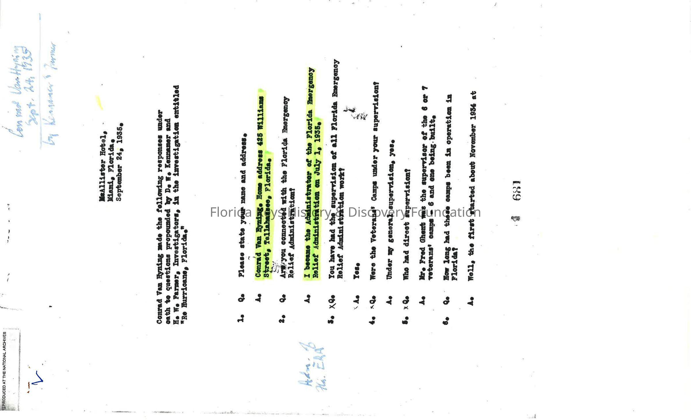 Sept. 24, 1935, "Conrad Van Hyning made the following responses under oath to questions propounded by D. W. Kennamer and H. W. Farmer, Investigators, in the investigation entitled 'Re Hurricane, Florida.'"Creator