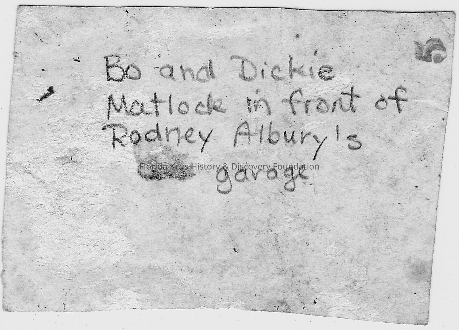 back of photo with caption "Bo and Dickie Matlock in front of Rodney Albury's garage"Collection