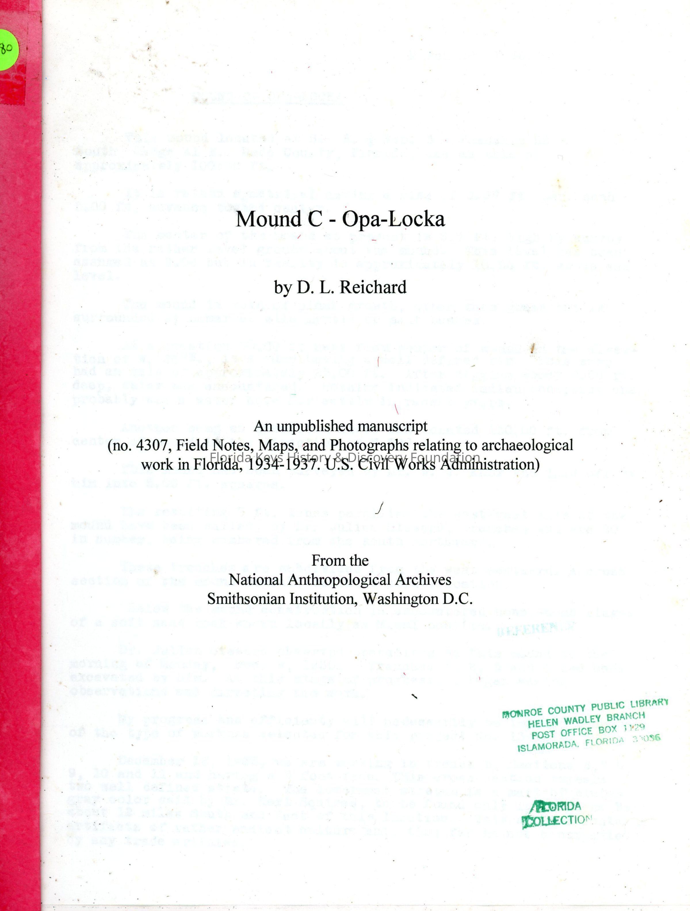 "An Unpublished Manuscript (no.4307, Field Notes, Maps, and Photographs relating to archaeological work in Florida, 1934-1937. U.S. Civil Works Administration)Context