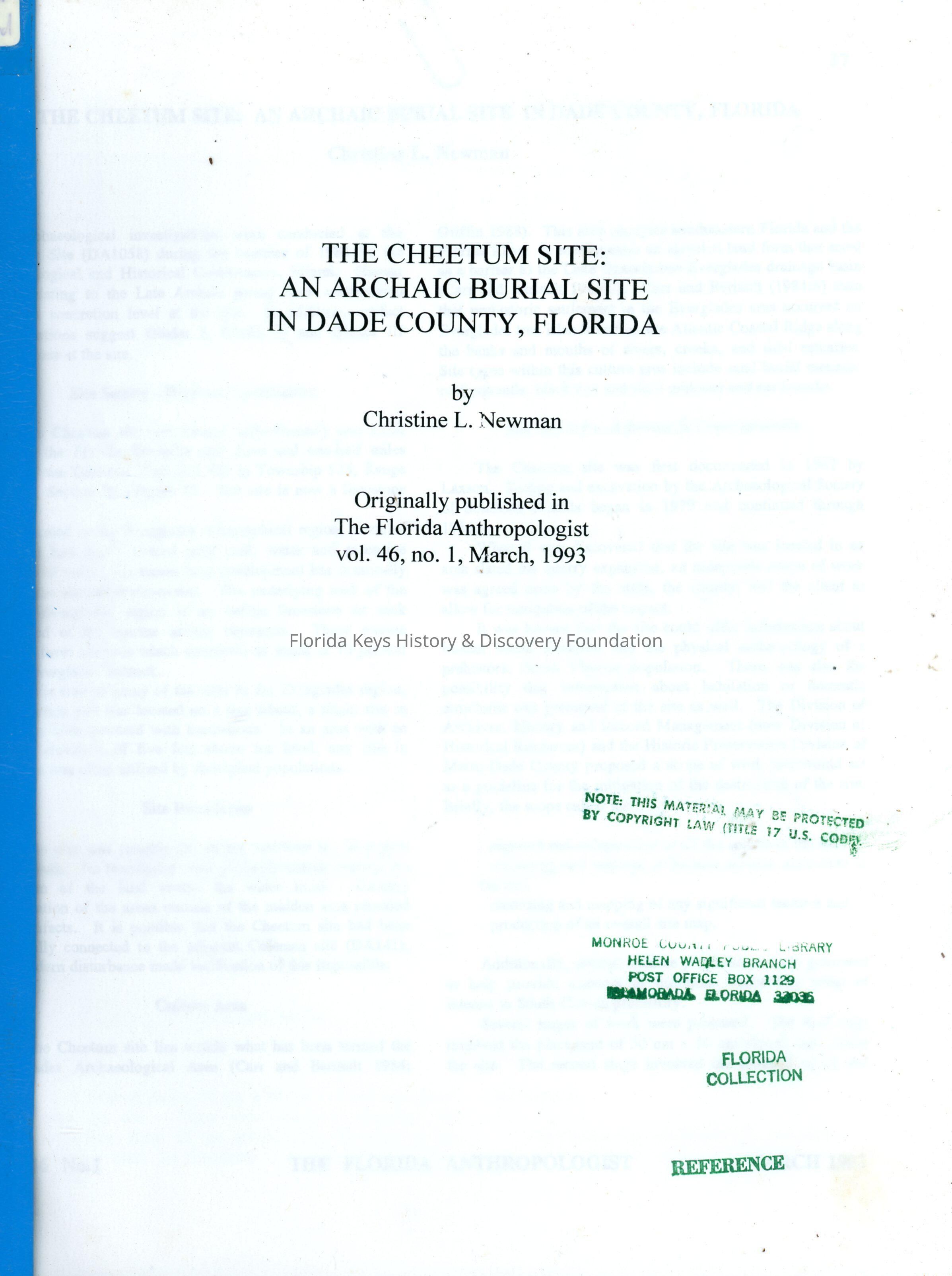 The Cheetum Site: An Archaic Burial Site in Dade County, FloridaEntry/Object ID