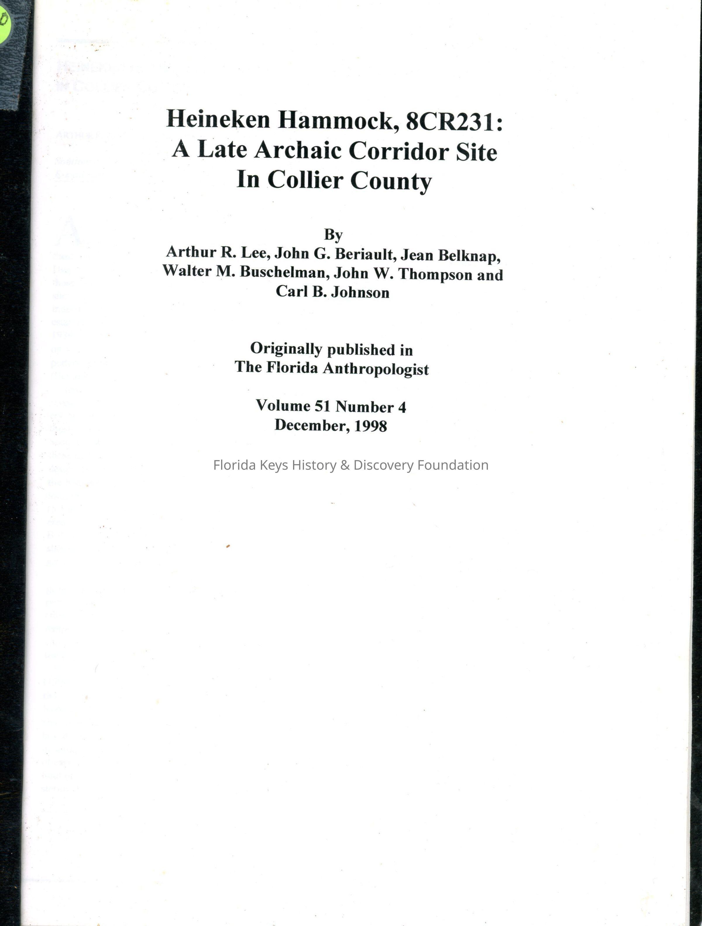 Heineken Hammock, 8CR231: A Late Archaic Corridor Site In Collier CountyEntry/Object ID
