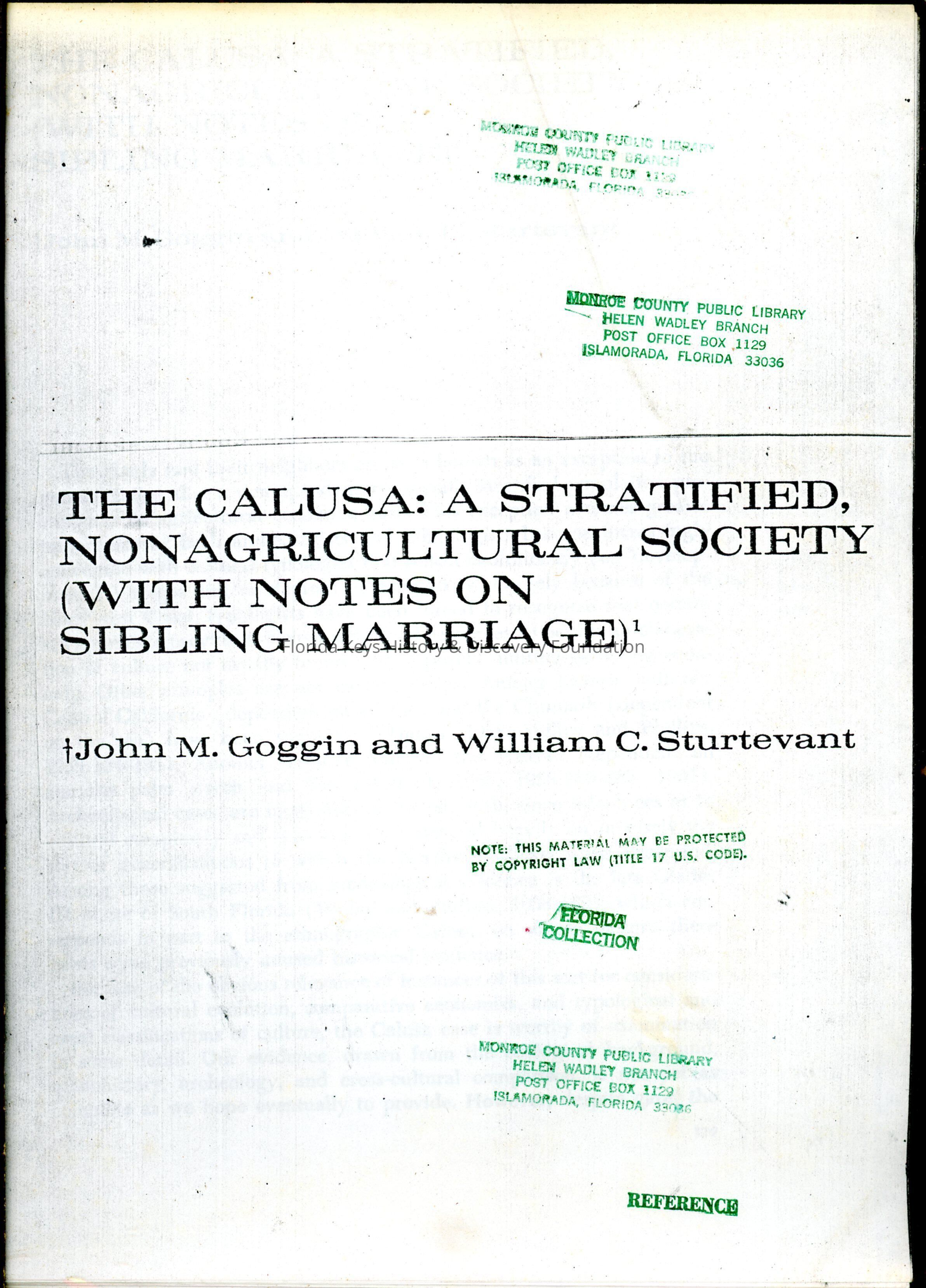 The Calusa: A Stratified Nonagricultural Society (With Notes on Sibling Marriage)Entry/Object ID