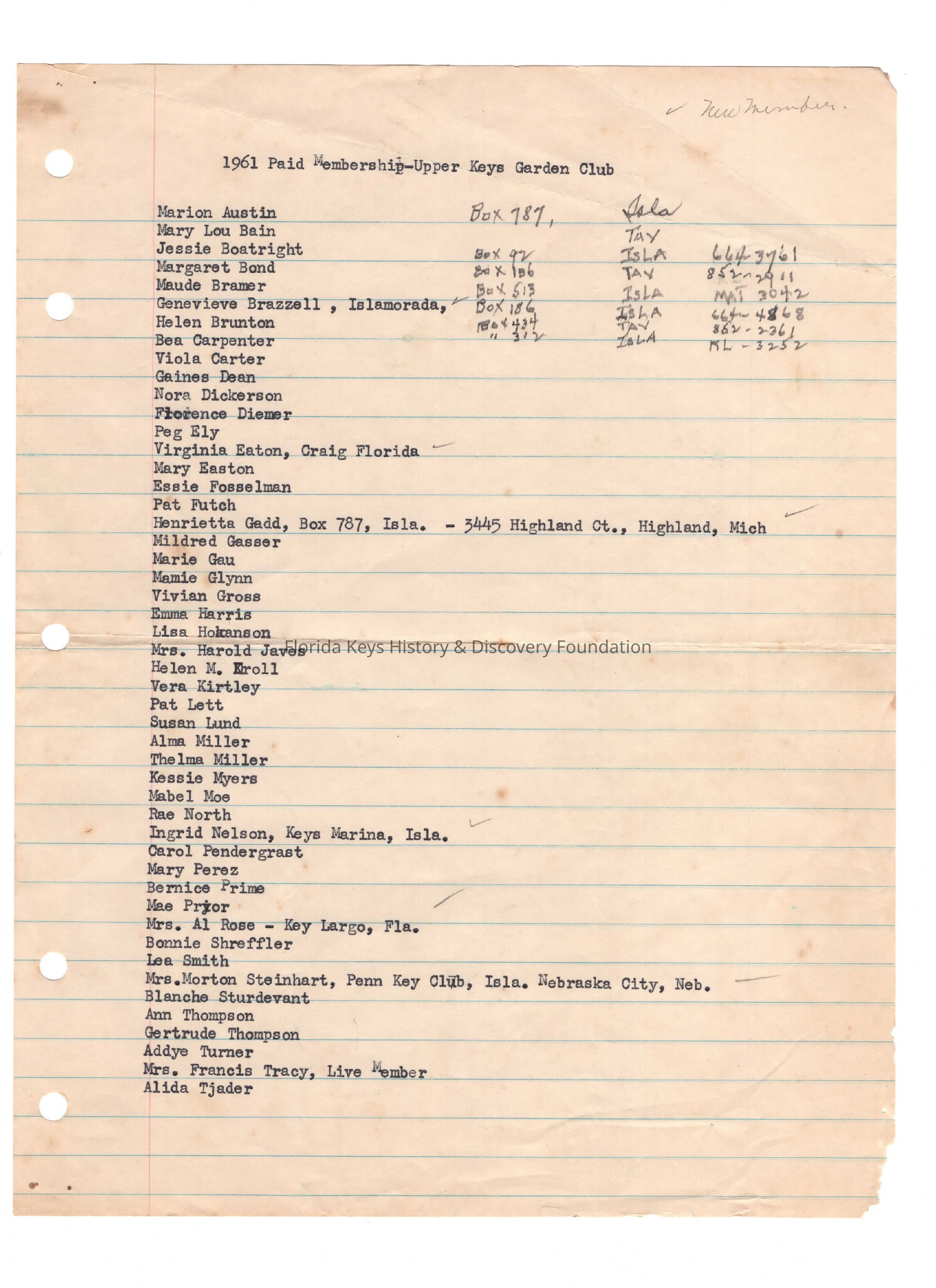 1961 Upper Keys Garden Club Membership ListEntry/Object ID