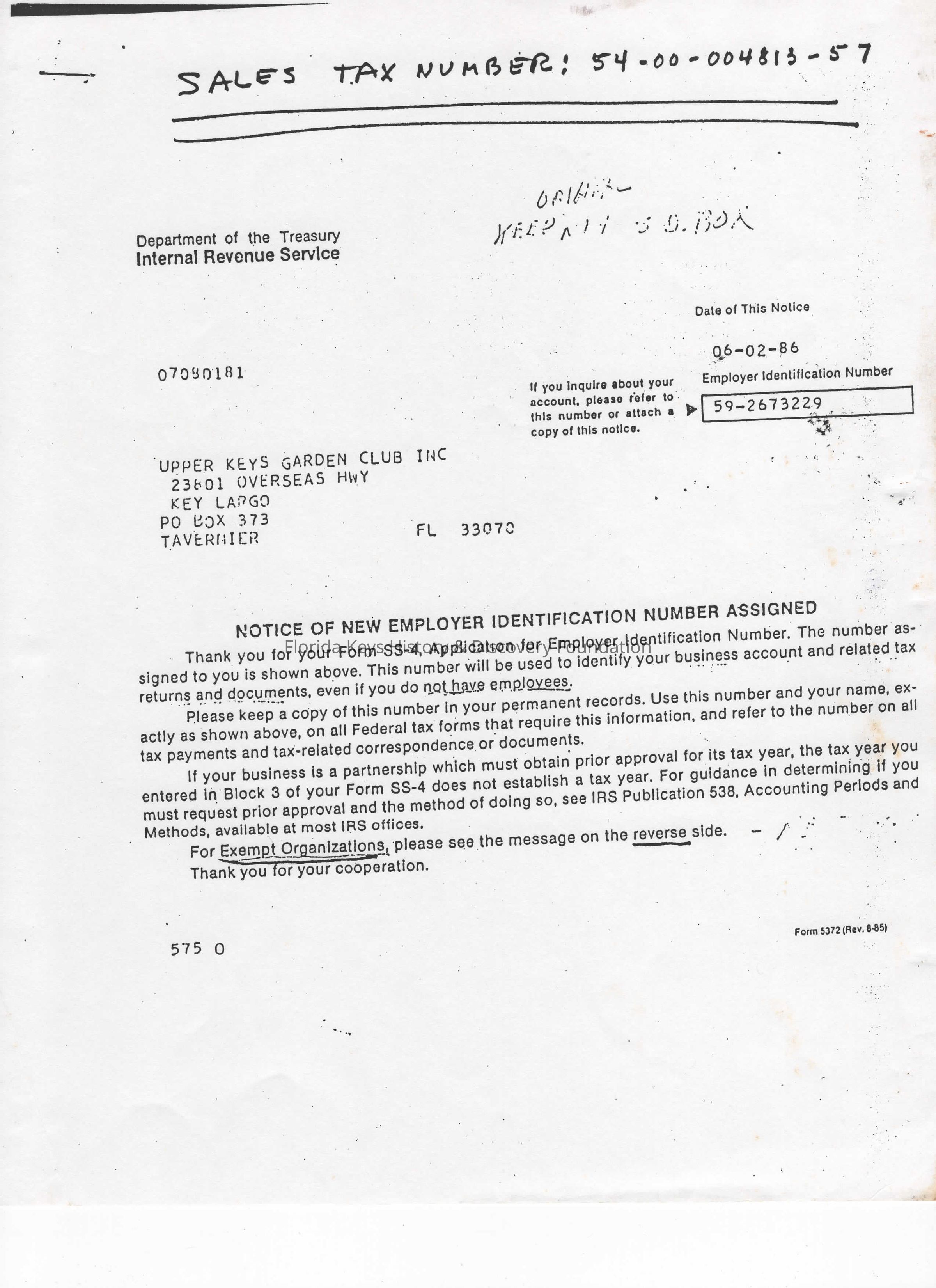 This is a letter from the IRS assigning a sales tax and employment number to the GCUKCollection