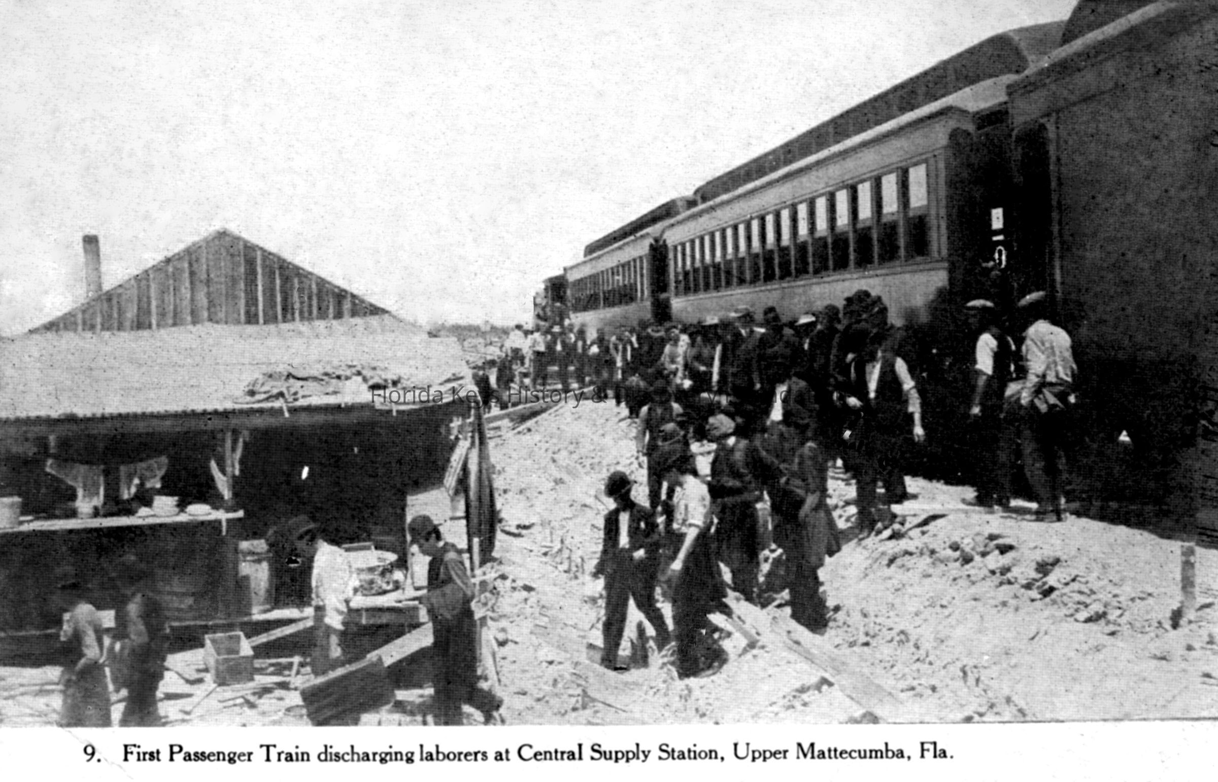 First Passenger train discharging laborers at Central Supply Station, Upper Mattecumba, Fla.Collection