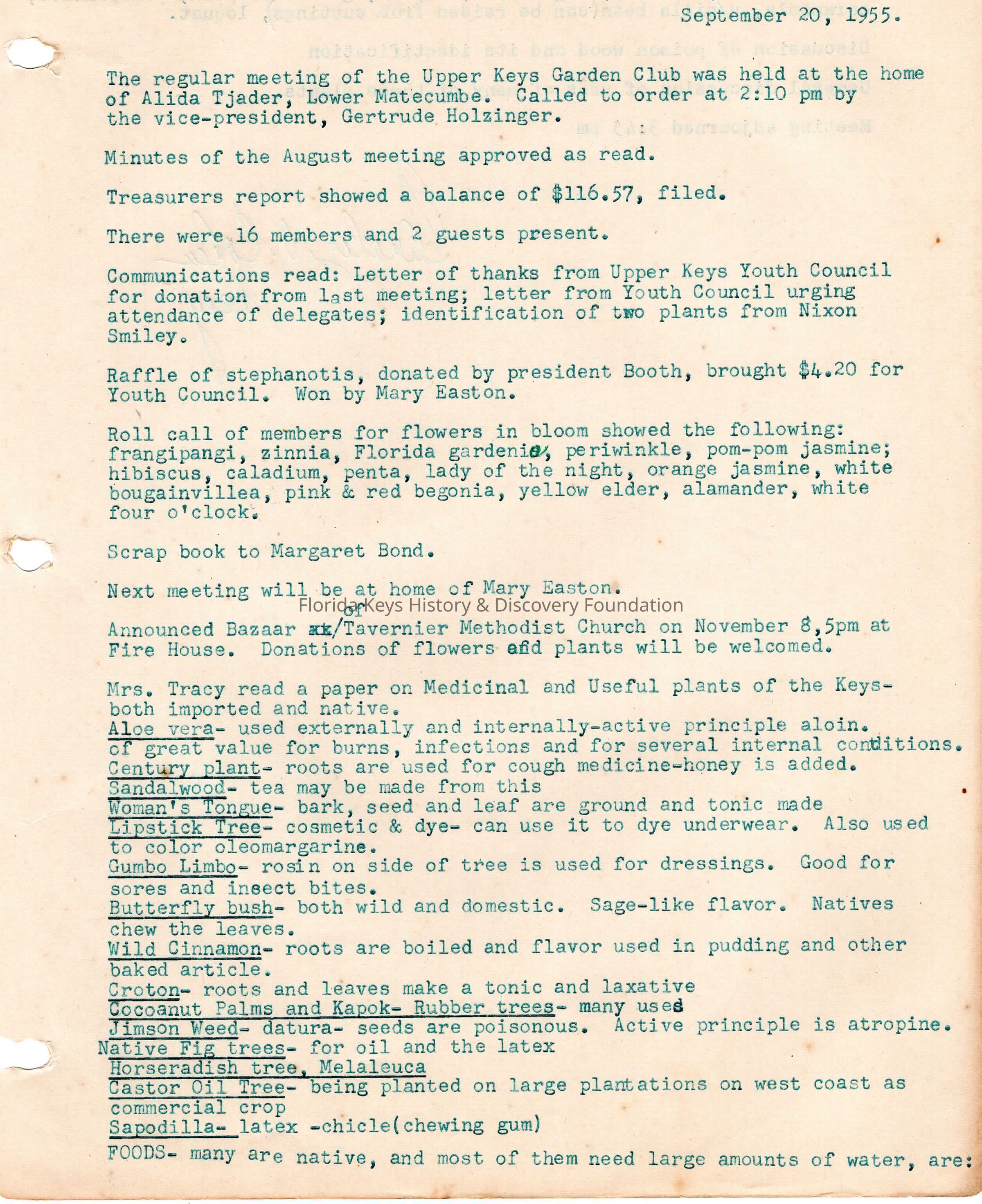 Minutes from club meeting held on September 20th, 1955 at the home of Mrs. Alida Tjader.Collection