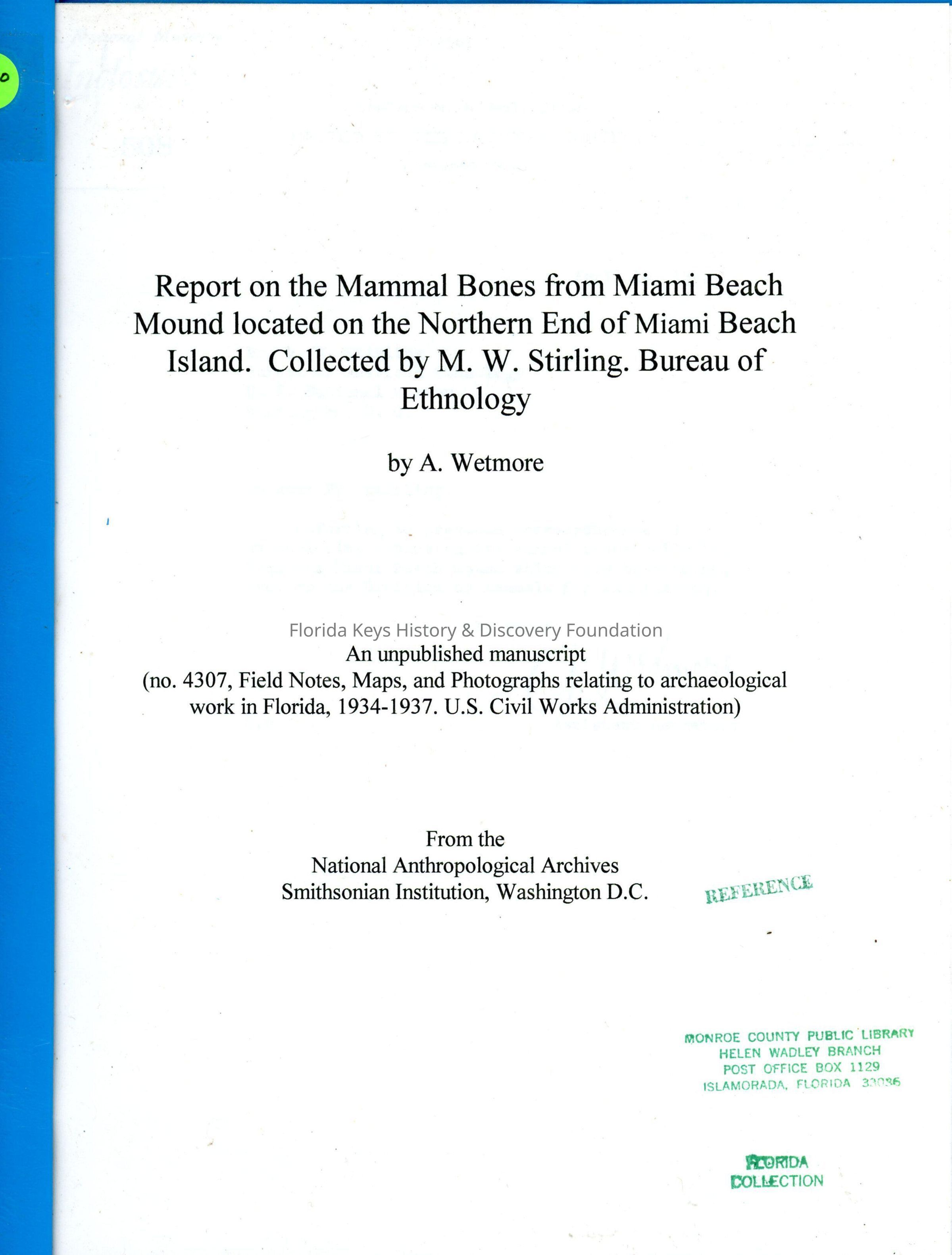 Report on the Mammal Bones from Miami Beach found located on the North End of Miami Beach Island. Collected by M.W. Stirling. Bureau of EthnolgyEntry/Object ID