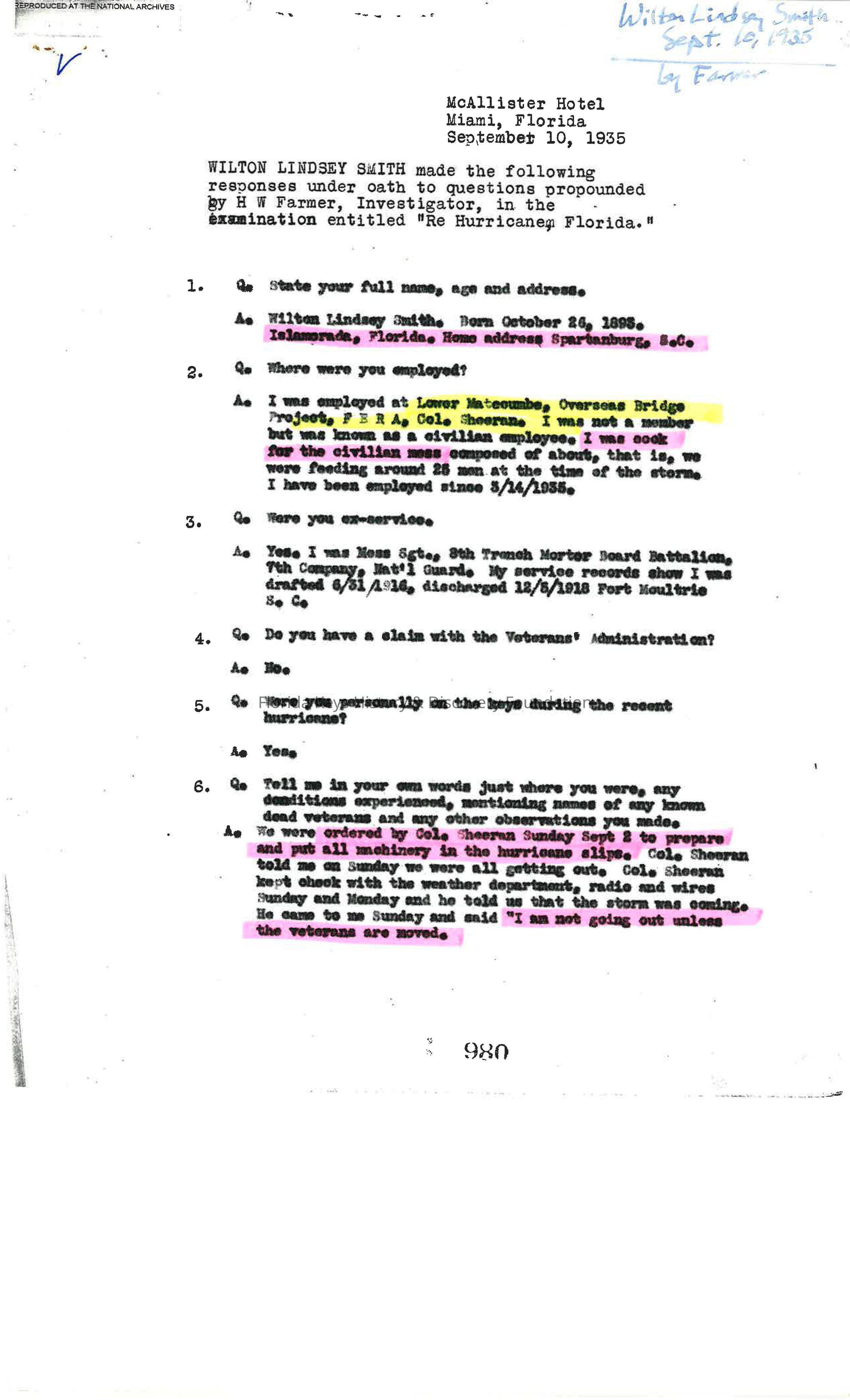 Sept. 10, 1935, "Wilton Lindsey Smith made the following responses under oath to questions propounded by H. W. Farmer, Investigator, in the examination entitled 'Re Hurricane Florida.'"Creator