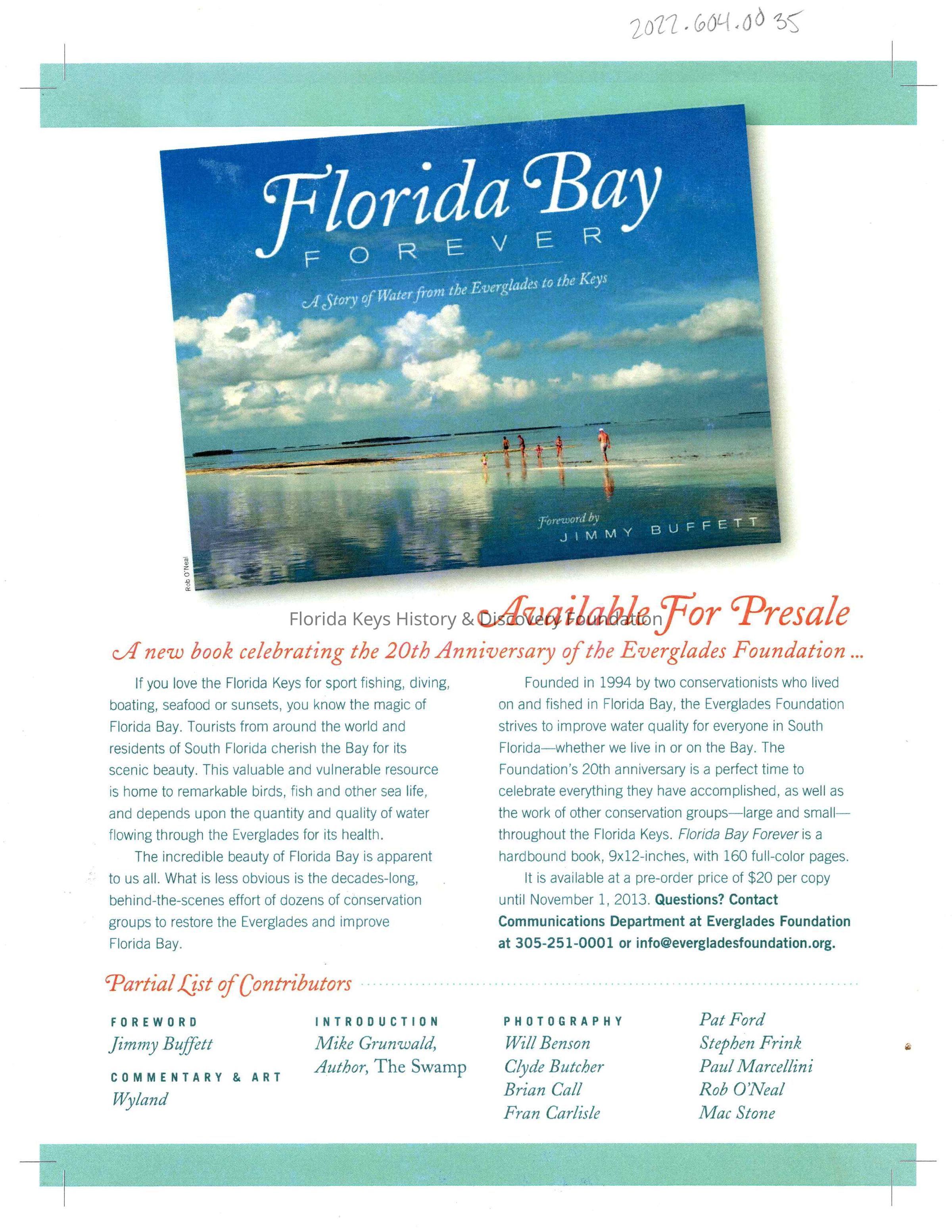 Printout about the book Florida Bay Forever and a page about a bird basket present to the Florida Keys Wild Bird Rehabilitation.