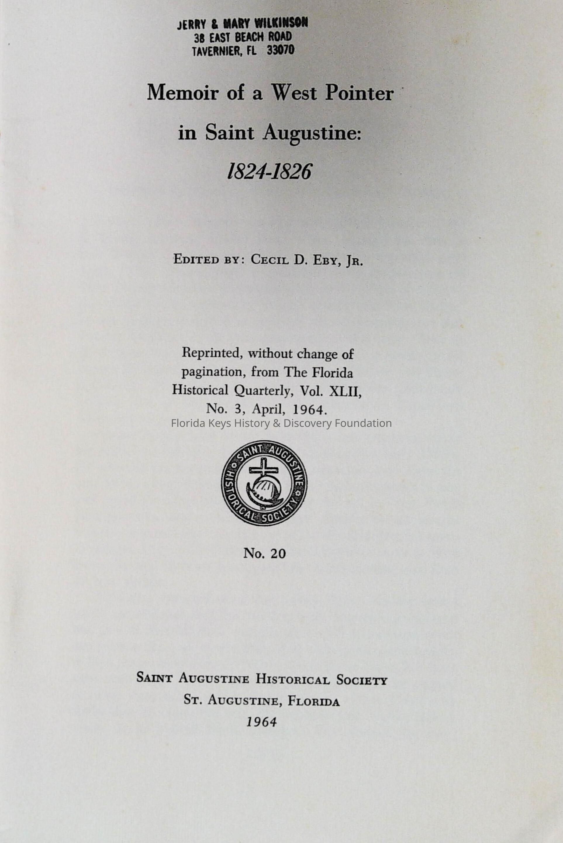 Memoirs of a Westpointer in St. Augustine 1824-1826Entry/Object ID