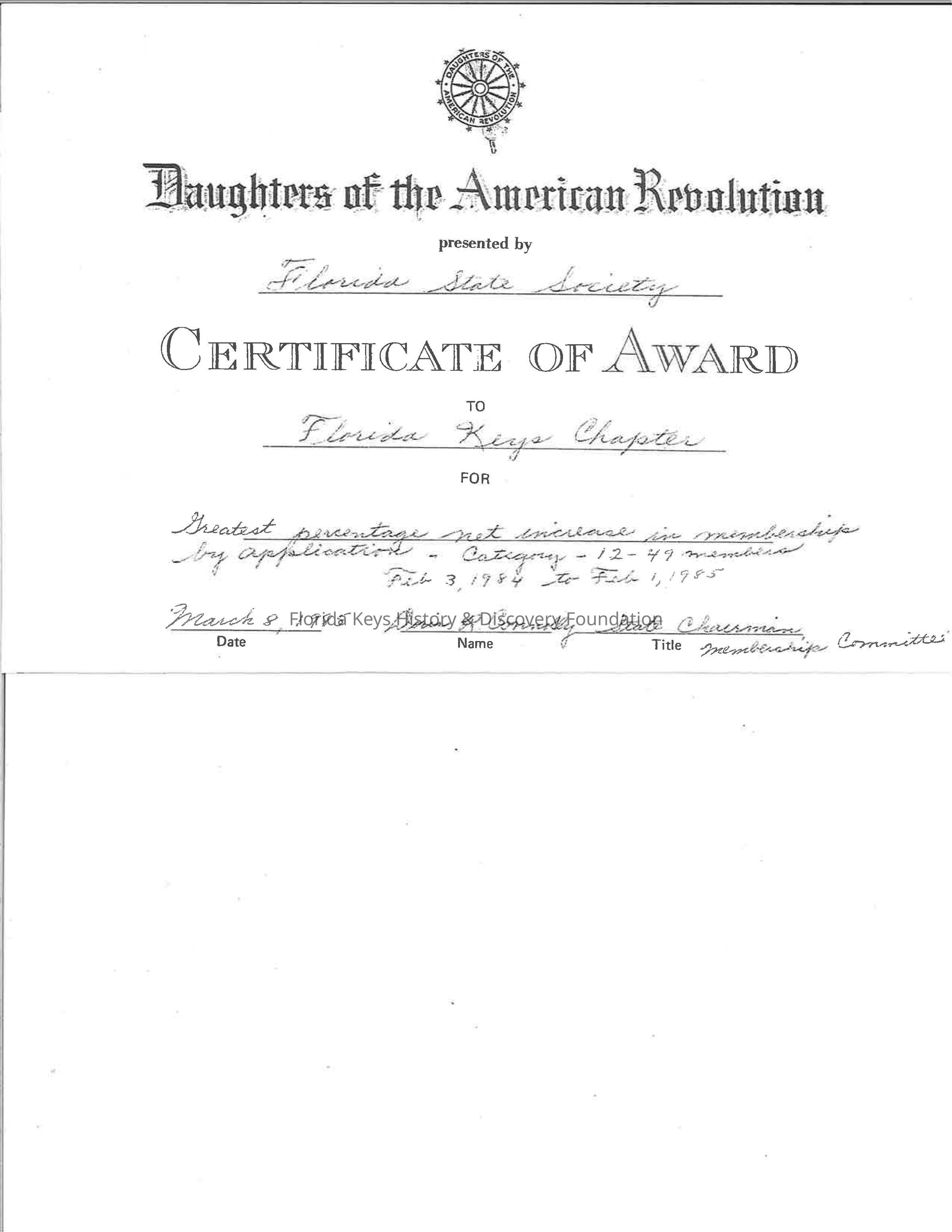 Certificate of Award by the Florida State Society, 1984-1985Entry/Object ID