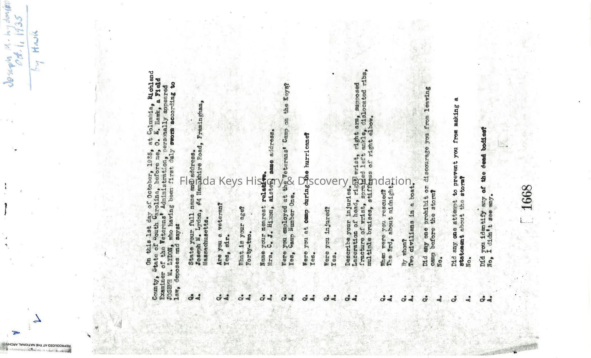 October 1, 1935, "On this 1st day of October, 1935, at Columbia, Richland County, State of South Carolina, before me, O. E. Hawk, a Field Examiner of the Veterans' Administration, personally appeared Joseph M. Lydon, who having been first duly sworn according to law, deposes and says..."Creator