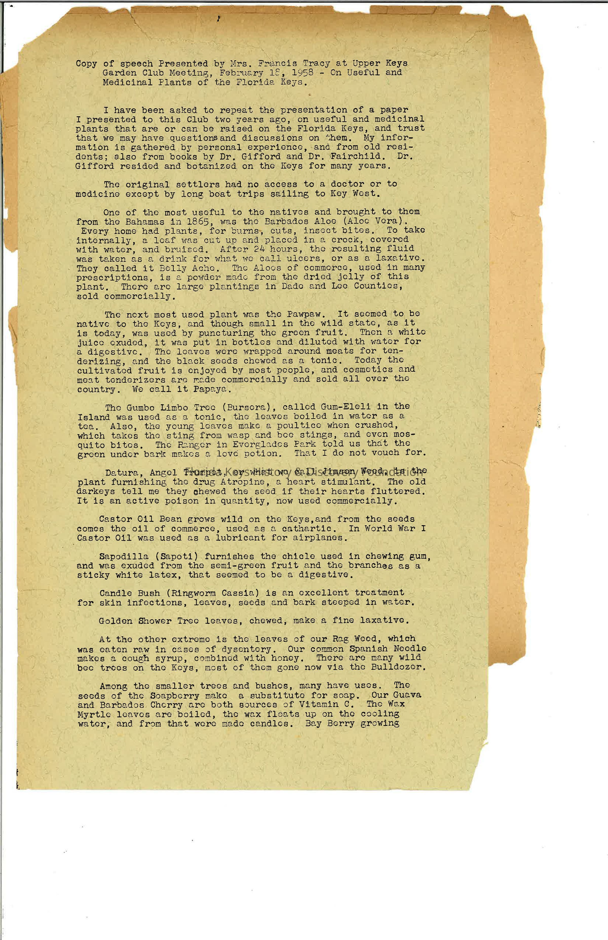 Speech presented by Francis Tracy on Medicinal Plants of the Florida Keys - Feb 18th, 1958 attached to Newspaper Clipping from 1956Collection