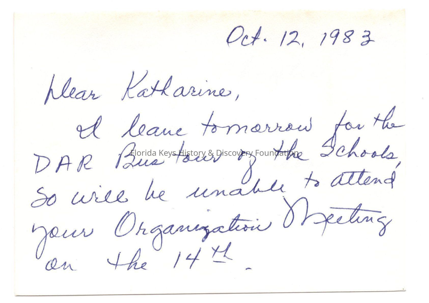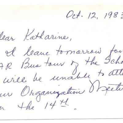 Letter, written by Mrs. Hutson sending her regrets about coming to the Organizational Meeting in October.Collection