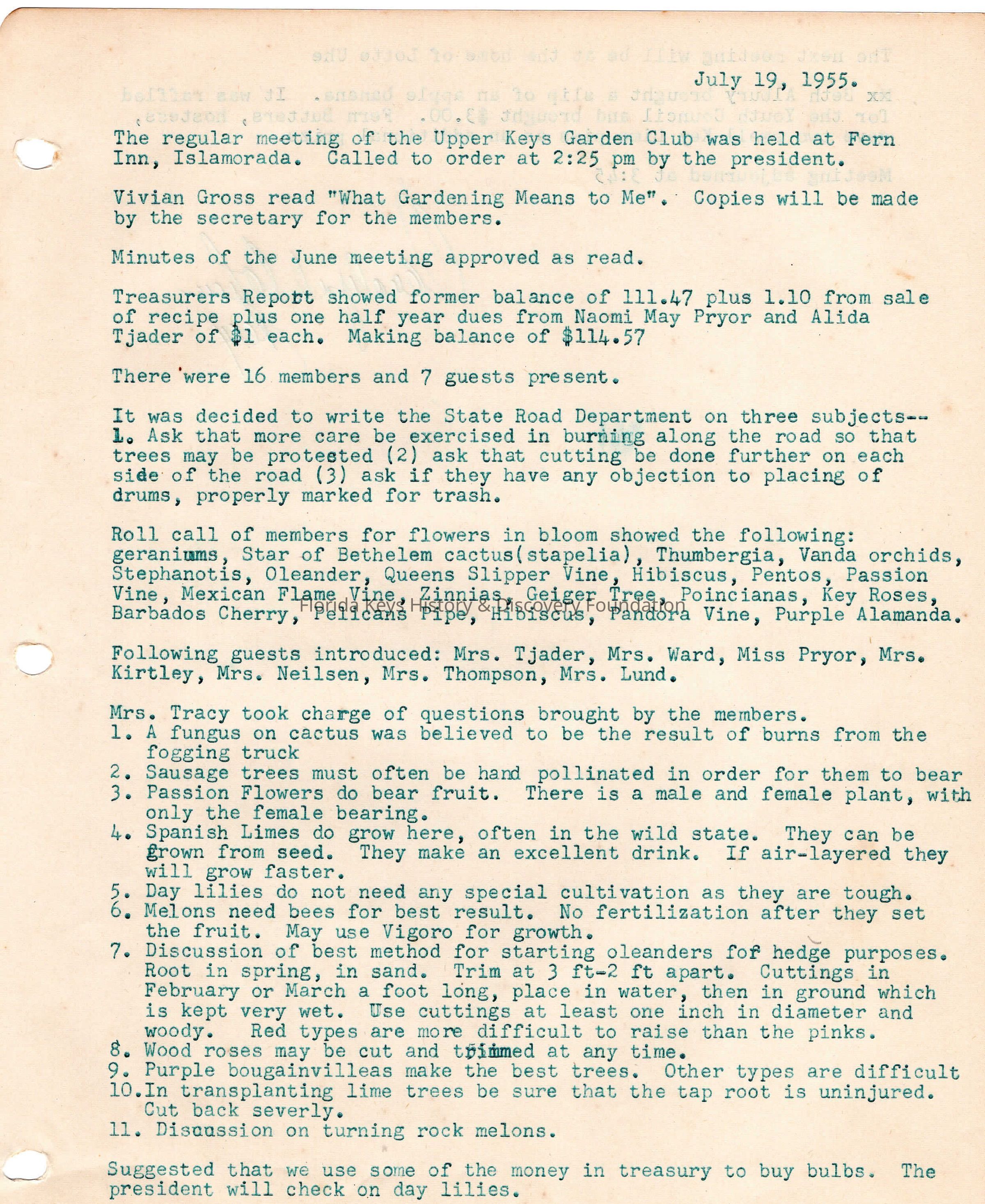 Minutes from club meeting held on July 19th, 1955 at the Fern Inn, Islamorada.Collection