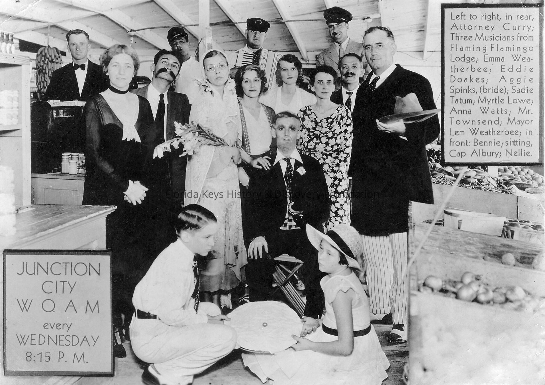 In Rear: Attorney Curry, 3 Musicians from Flaming Flamingo Lodge, Emma Weatherbee, Eddie Doakes, Aggie Spinks, bride, Sadie Tatum, Myrtle Lowe, Anna Watts, Mr. Townsend, Mayor Lem Weatherbee