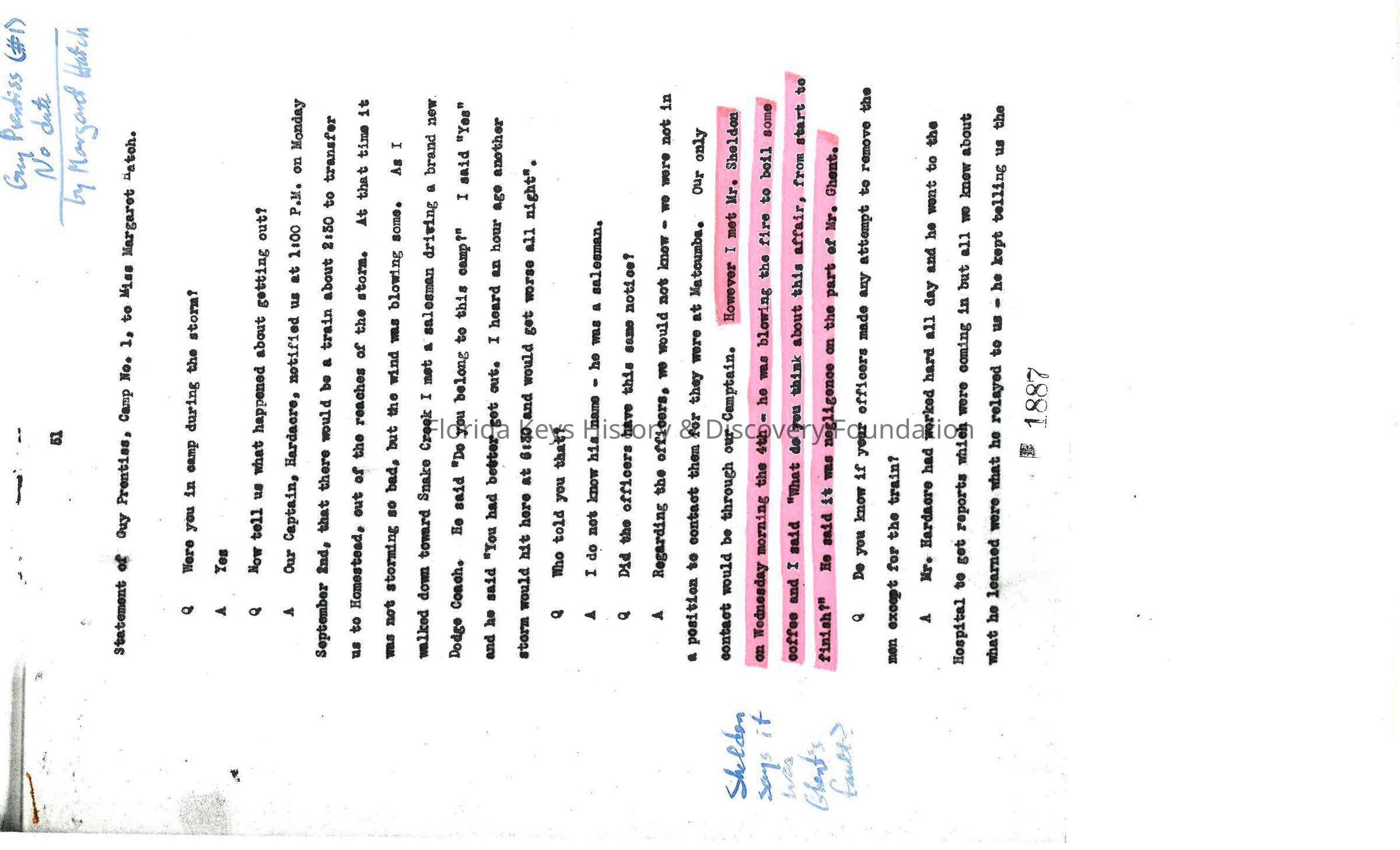 Statement of Guy Prentiess, Camp No. 1, to Miss Margaret HatchCreator