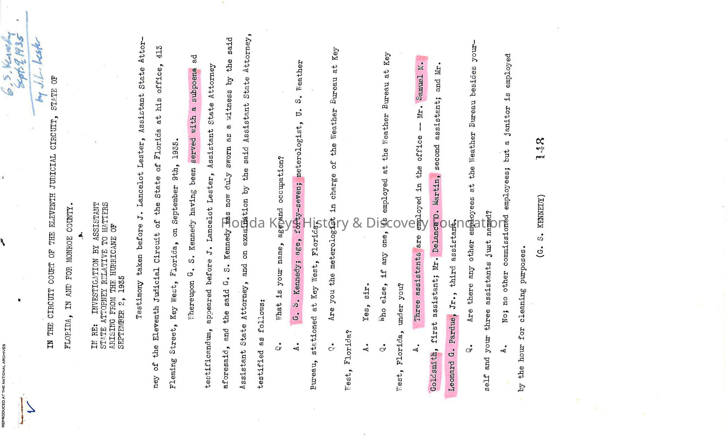 Sept. 9 and 10,1935, "In the Circuit Court of the Eleventh Judicial Circuit, State of Florida, in and for Monroe County. In Re: Investigation by Assistant State Attorney relative to matters arising from the hurricane of September 2, 1935.