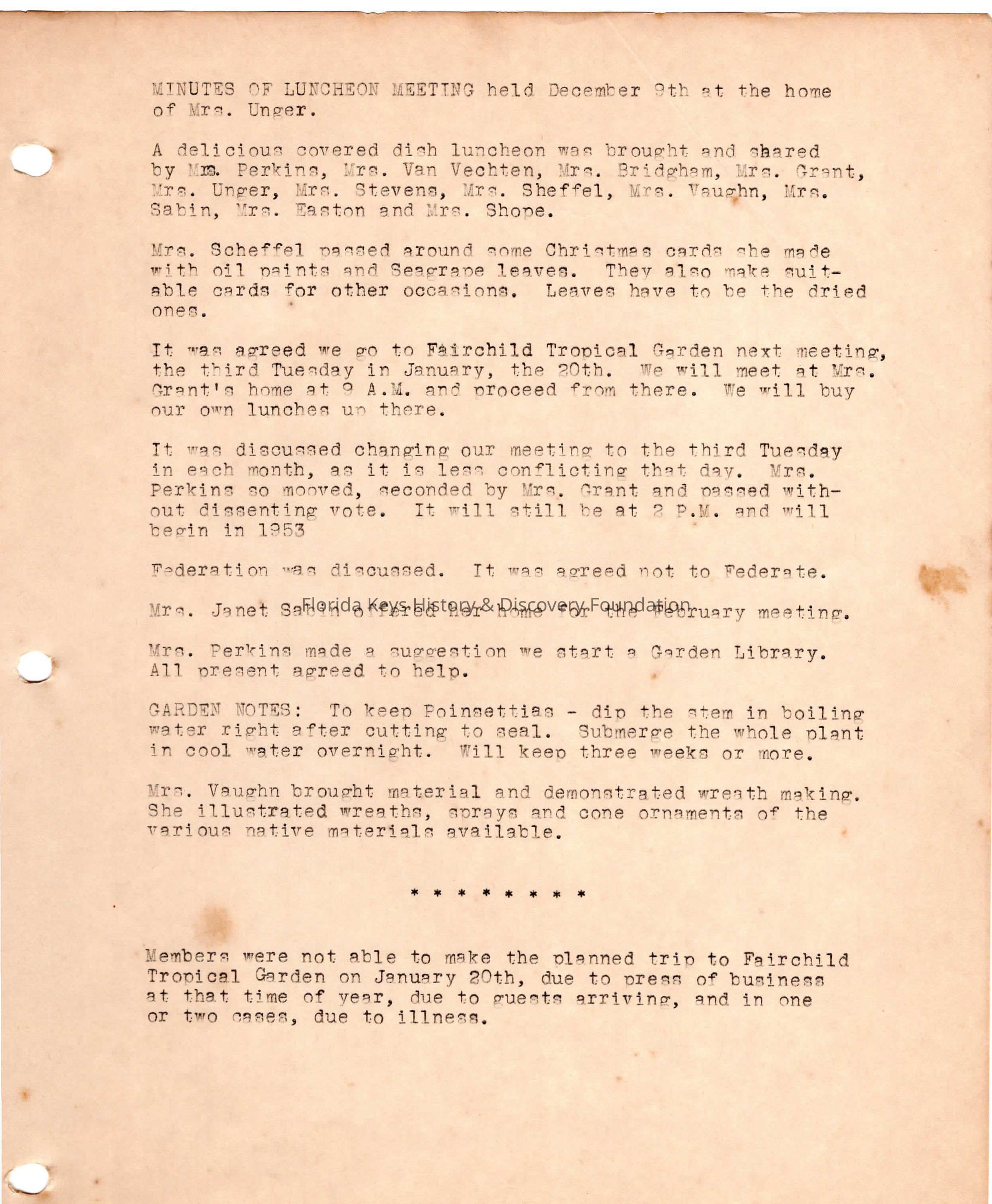 Minutes from luncheon meeting held on December 9th, 1952 at the home of Mrs. Olga Unger.Collection