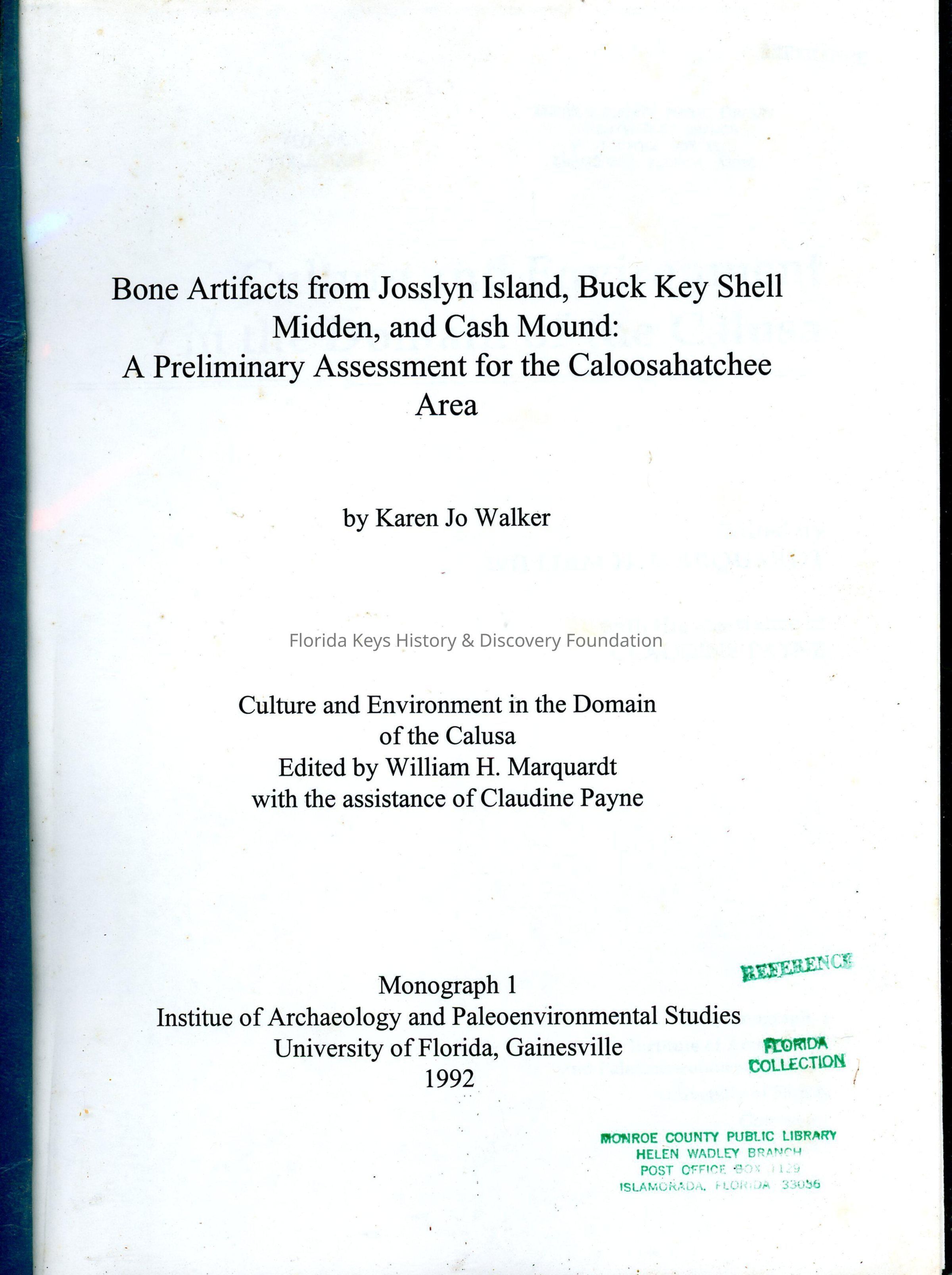 Bone Artifacts from Josslyn Island, Buck Key Shell Midden, and Cash Mound: A Preliminary Assessment for the Caloosahatchee AreaEntry/Object ID