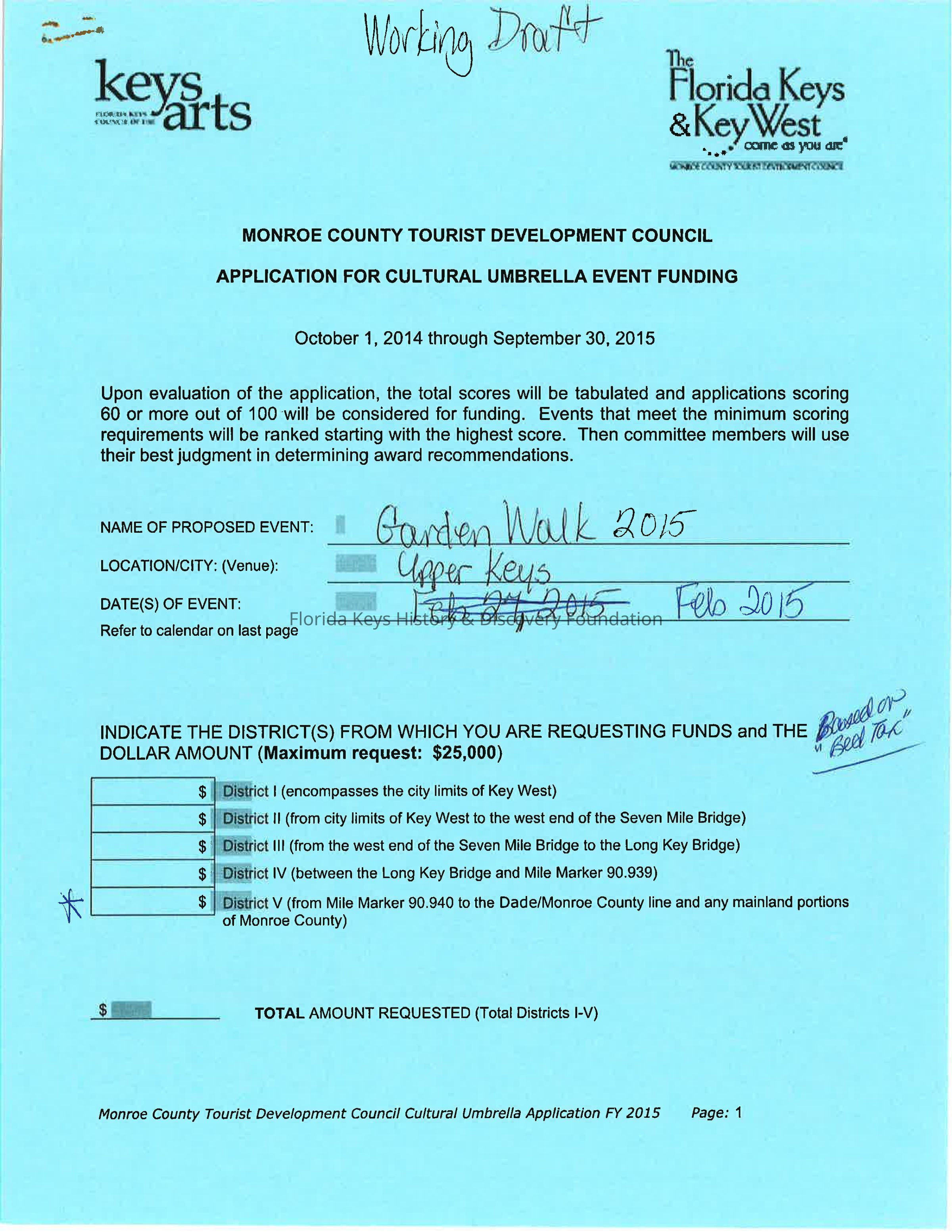 A working draft of the Cultural Umbrella Event Funding application by the Garden Club of the Upper Keys. It appears that the GCUK applied for this funding to help with their annual Garden Walk. This draft is incomplete and contains handwriting and notes in the margins.