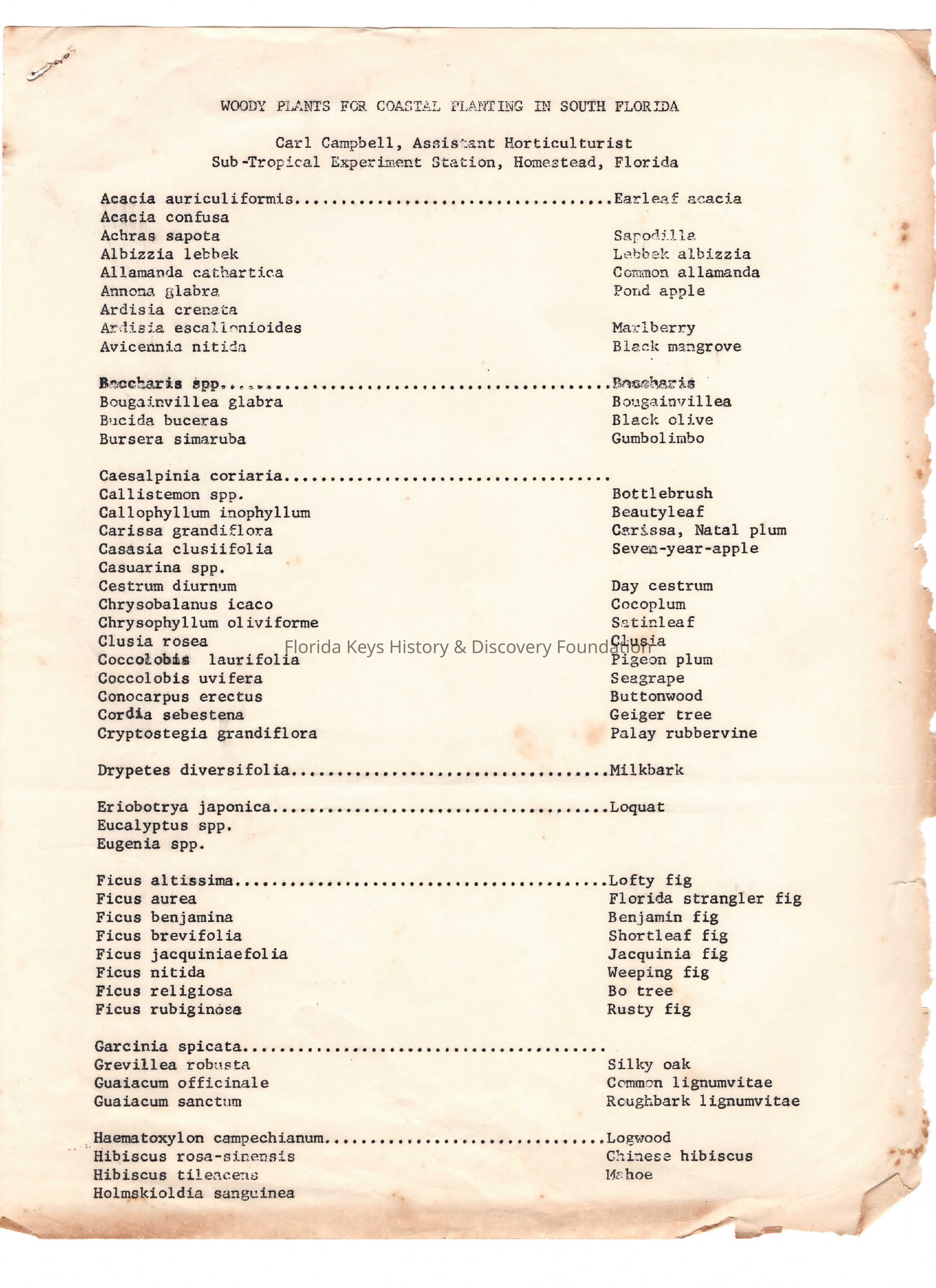 List of Woody Plants for Coastal Planting in South Florida by assistant horticulturalist Carl Campbell at the Sub-Tropical Experiment Station in Homestead, FL.Collection