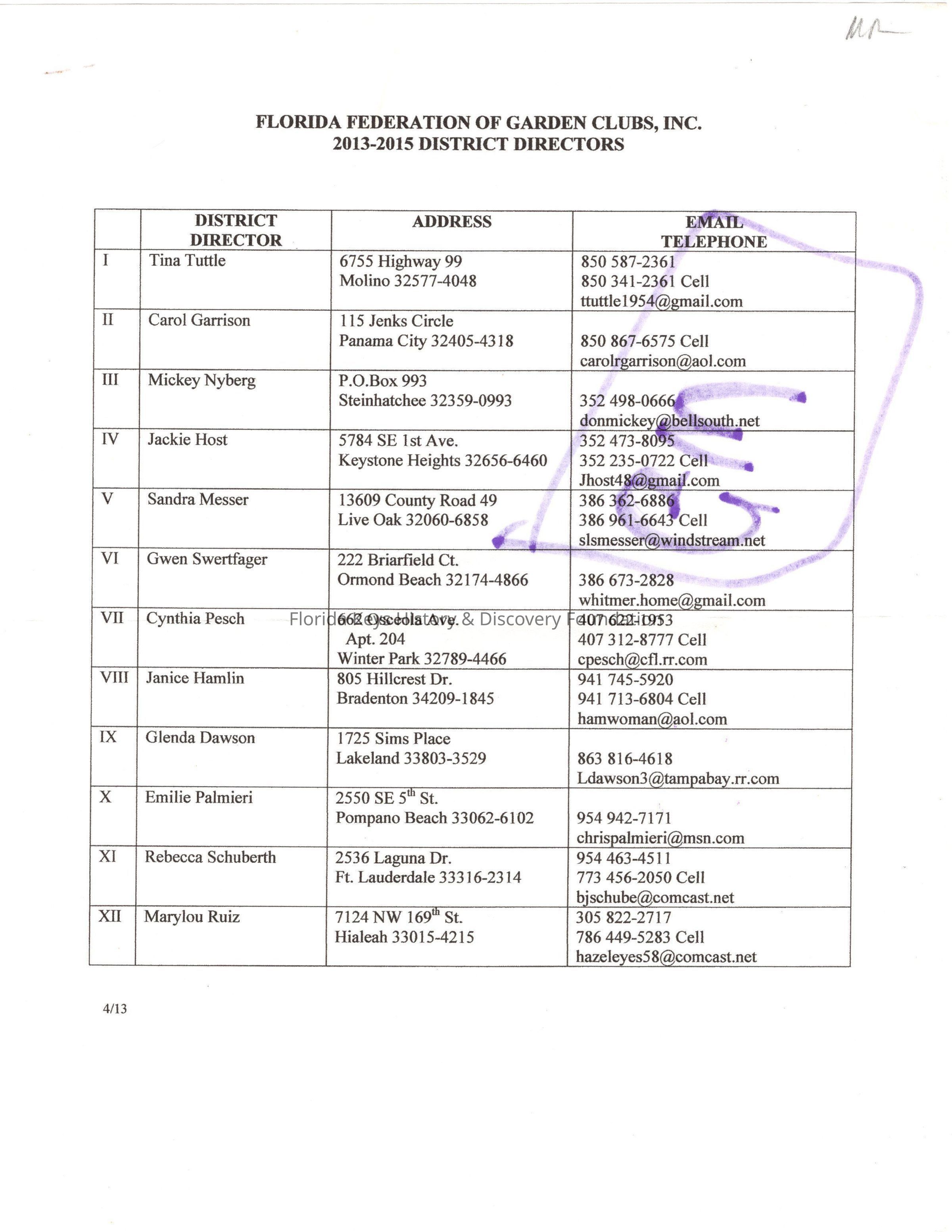 Florida Federation of Garden Clubs 2013-2015 District Directors Contact SheetEntry/Object ID
