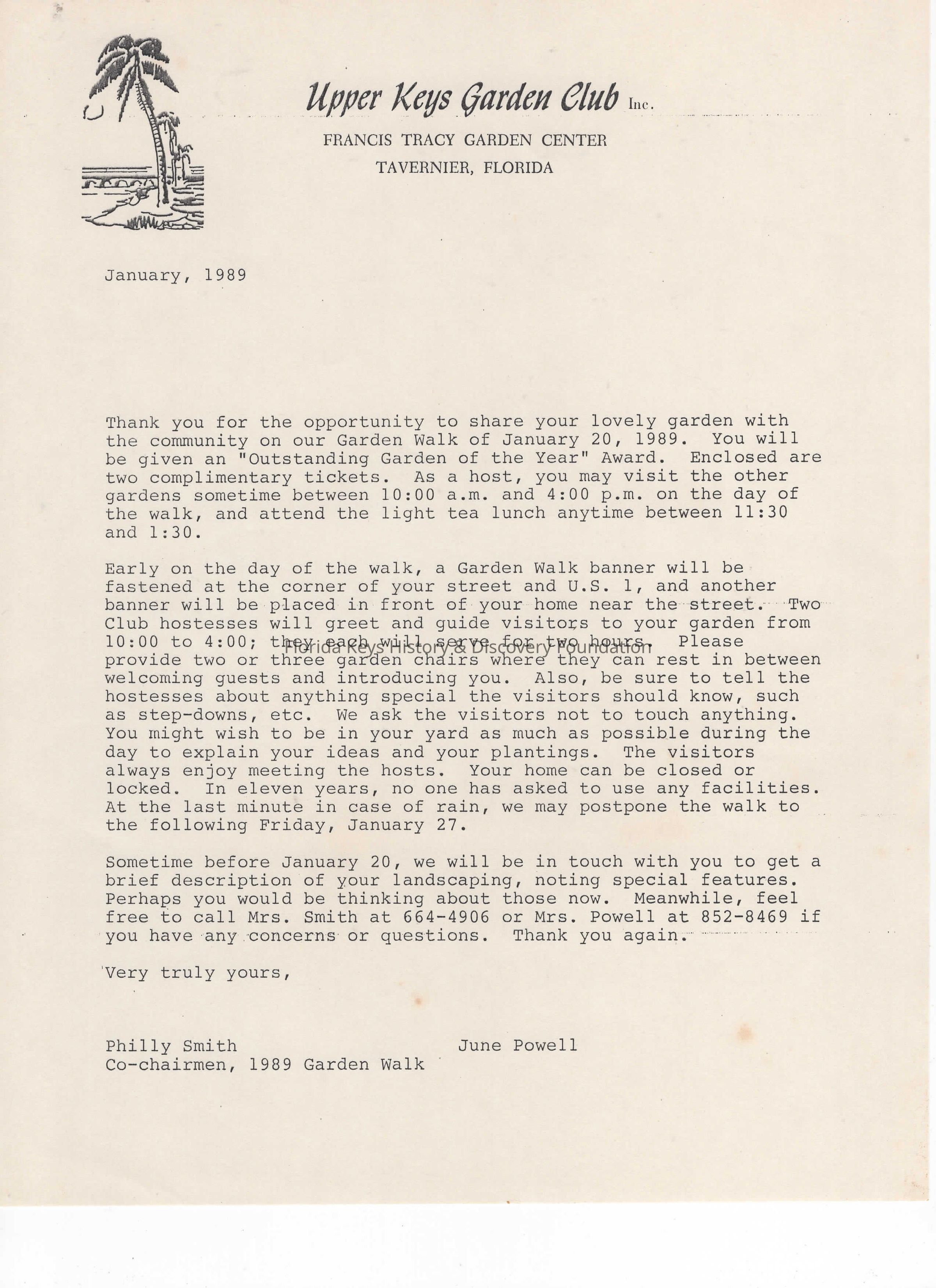 This is a letter written by the Garden Walk chair-people to the upcoming Garden of the Year award winner informing them of the award and their role as a hostCollection